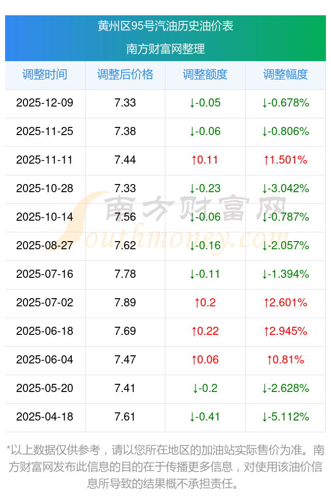 黃州區(qū)汽油柴油12月13日每升的價格為12月9日調(diào)整后的價格,各油價詳情如下:92號汽油6.85元;95號汽油7.33元;0號柴油6.47元。