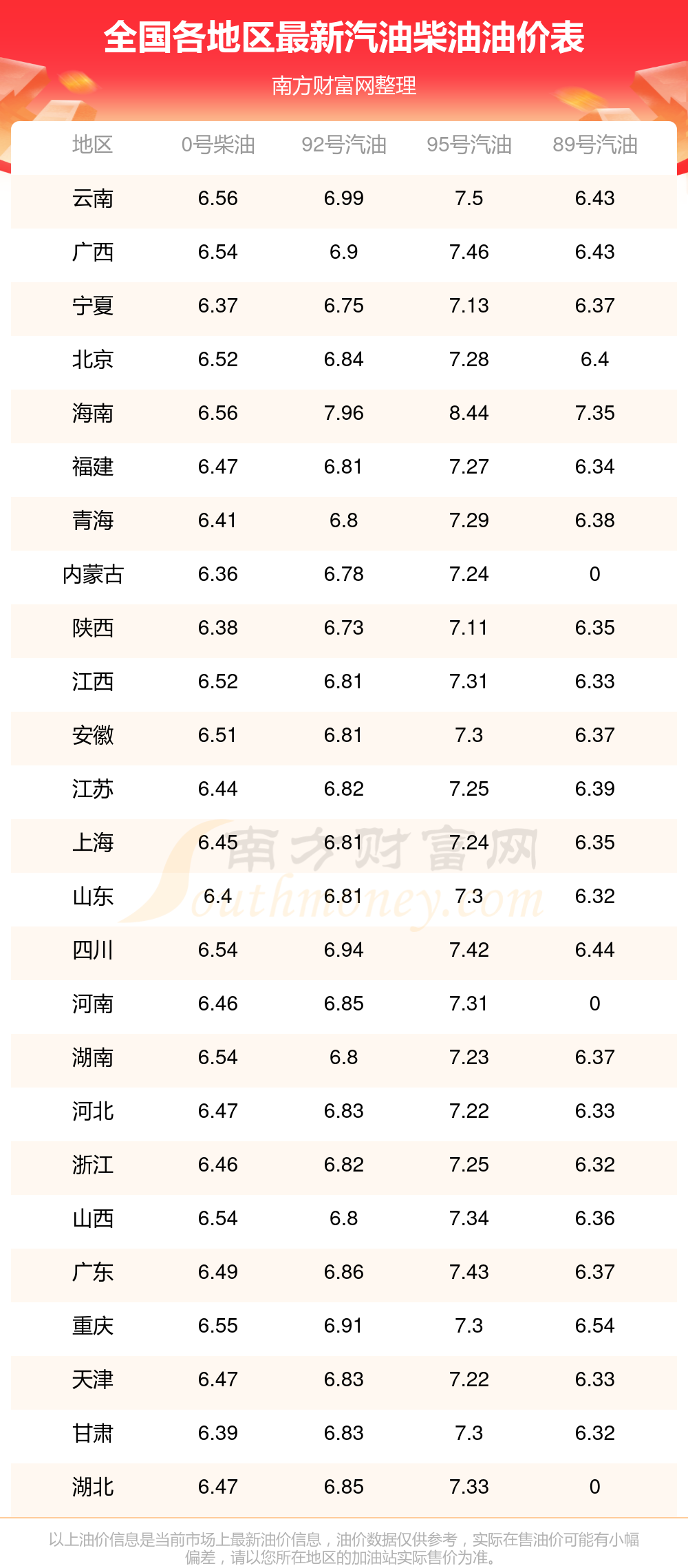 全國各地區(qū)最新汽油價格表