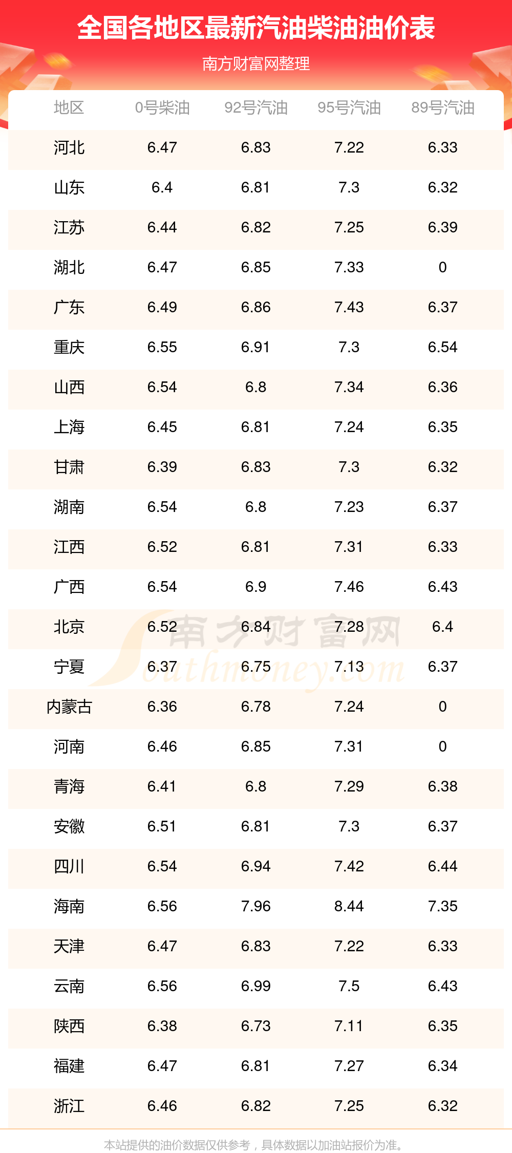 本次油價(jià)的調(diào)整時(shí)間為12月9日,調(diào)整后全國92號汽油平均價(jià)格為7元每升,其中,最低的是陜西,6.73元每升,最高的是海南,7.96元每升。全國95號汽油平均價(jià)格為7元每升,其中,最低的是陜西,7.11元每升,最高的是海南,8.44元每升。全國0號柴油平均價(jià)格為:6元每升,其中,最低的是內(nèi)蒙古,6.36元每升,最高的是海南,6.56元每升。全國89號汽油平均價(jià)格為6元每升,其中,最低的是浙江,6.32元每升,最高的是海南,7.35元每升。,下一輪油價(jià)調(diào)整時(shí)間12月22日24時(shí),距離現(xiàn)在還有8.81天。