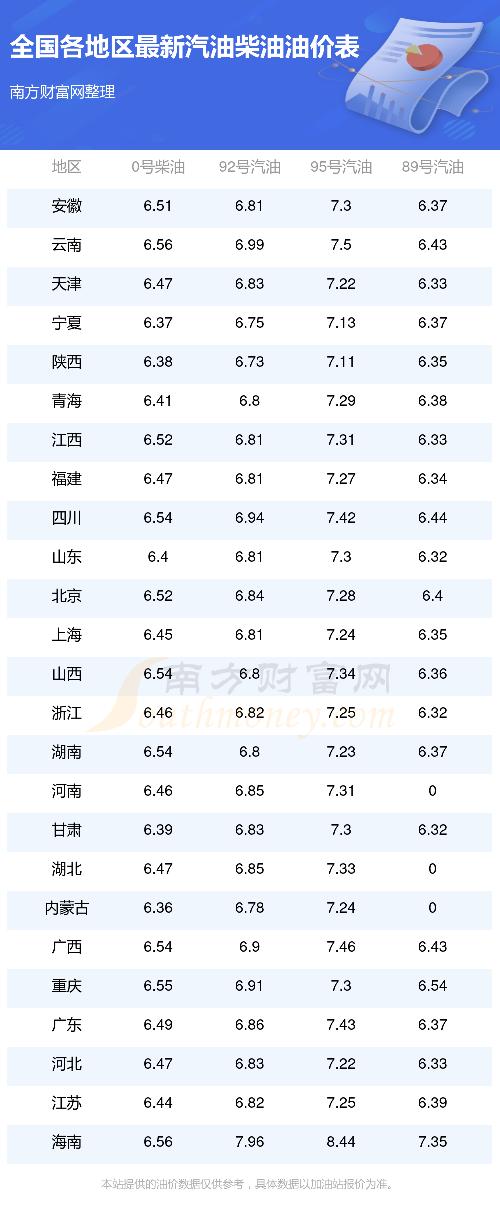 0號(hào)柴油平均價(jià)格:6元每升,其中,最高為海南,價(jià)格為6.56元/升,最低為內(nèi)蒙古,價(jià)格為6.36元/升。