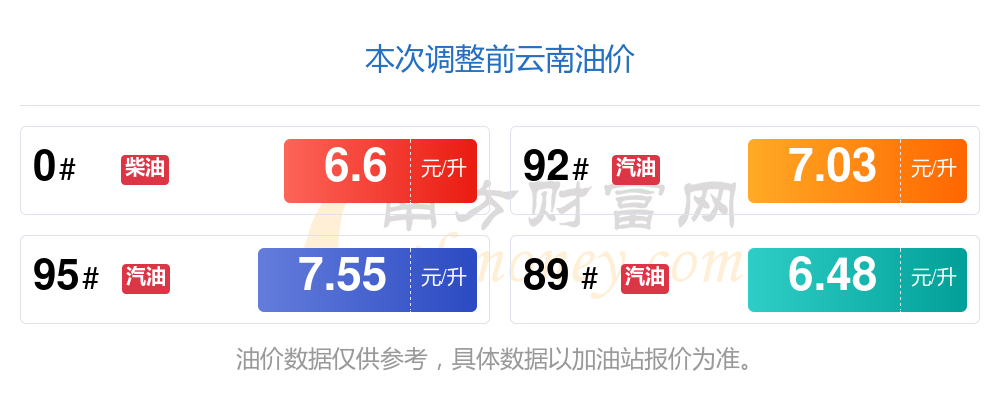 汽油價格調(diào)整最新消息:下一輪油價調(diào)整時間12月22日24時。12月14日,云南汽油、柴油每升最新價格為:調(diào)整時間為12月9日,92號汽油為6.99元,減了0.04元,減幅達0.57%;95號汽油為7.5元,減了0.05元,減幅達0.66%;89號汽油為6.43元,減了0.05元,減幅達0.77%;0號柴油為6.56元,減了0.04元,減幅達0.61%。