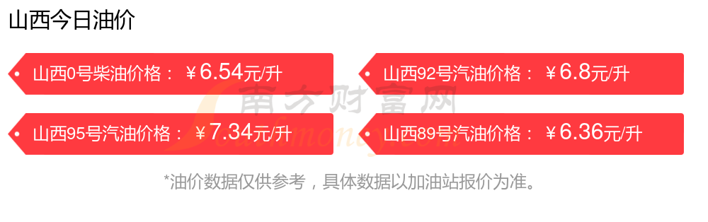 油價調整最新消息:山西汽油、柴油12月14日每升最新價格為:92號汽油為6.8元;95號汽油為7.34元;89號汽油為6.36元,下跌了0.04;0號柴油為6.54元,調整時間為12月9日。下一輪油價調整時間12月22日24時。
