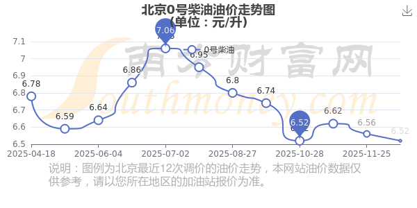 12月14日,北京0號(hào)柴油的價(jià)格是6.52元每升,本次的調(diào)整時(shí)間為12月9日,對(duì)比上次的調(diào)整降了0.04元,降0.61%,下次調(diào)整時(shí)間為12月22日24時(shí),還有8.7天。
