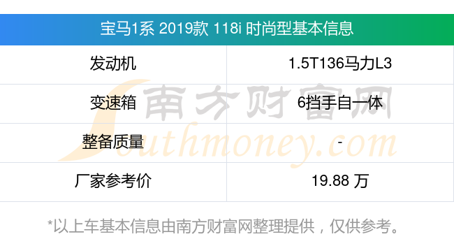 在動(dòng)力上,寶馬1系 2019款 118i 時(shí)尚型配備的是一臺(tái)1.5T136馬力L3渦輪增壓發(fā)動(dòng)機(jī),匹配的是6擋手自一體自動(dòng)檔變速箱,燃料形式為汽油,廠家參考價(jià)19.88萬元。