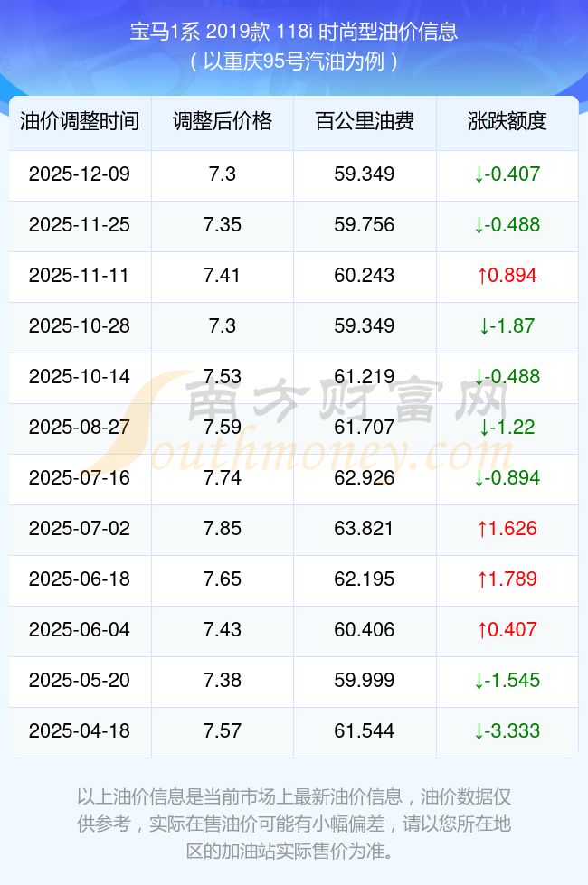 按照12月9日95號(hào)汽油最新調(diào)整價(jià)格7.3元/升來計(jì)算(以重慶為例),該車型百公里平均油費(fèi)為59.349元,按照上一輪11月25日調(diào)整價(jià)格7.35元/升來計(jì)算,百公里平均油費(fèi)為59.756元,對(duì)比上一輪少花0.407元,下一輪油價(jià)調(diào)整時(shí)間為12月22日24時(shí)。