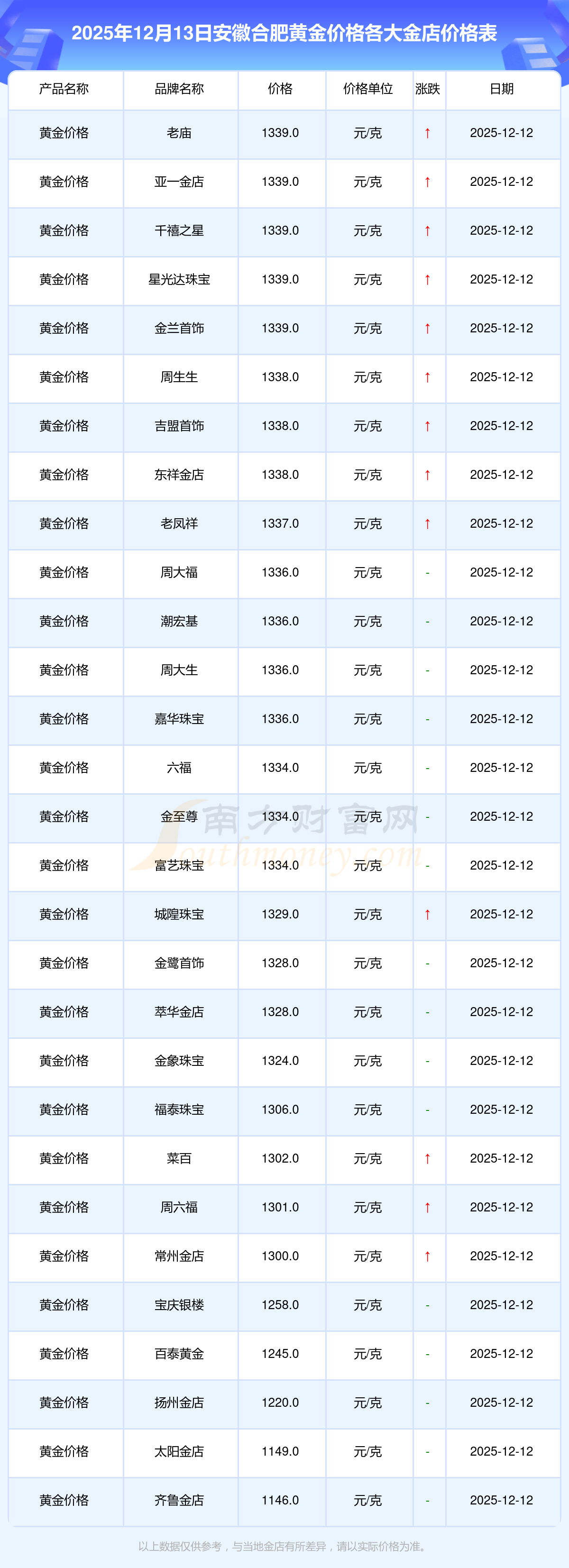2025年12月13日安徽合肥各大金店黃金價(jià)格最新價(jià)格查詢(xún)來(lái)了:周大福1336.0元/克,周大福681.0元/克,老鳳祥1337.0元/克,老鳳祥650.0元/克,老廟1339.0元/克,老廟600.0元/克,周生生1338.0元/克,周生生681.0元/克,周大福1336.0元/克,周大福47410.0,周大福19550.0。