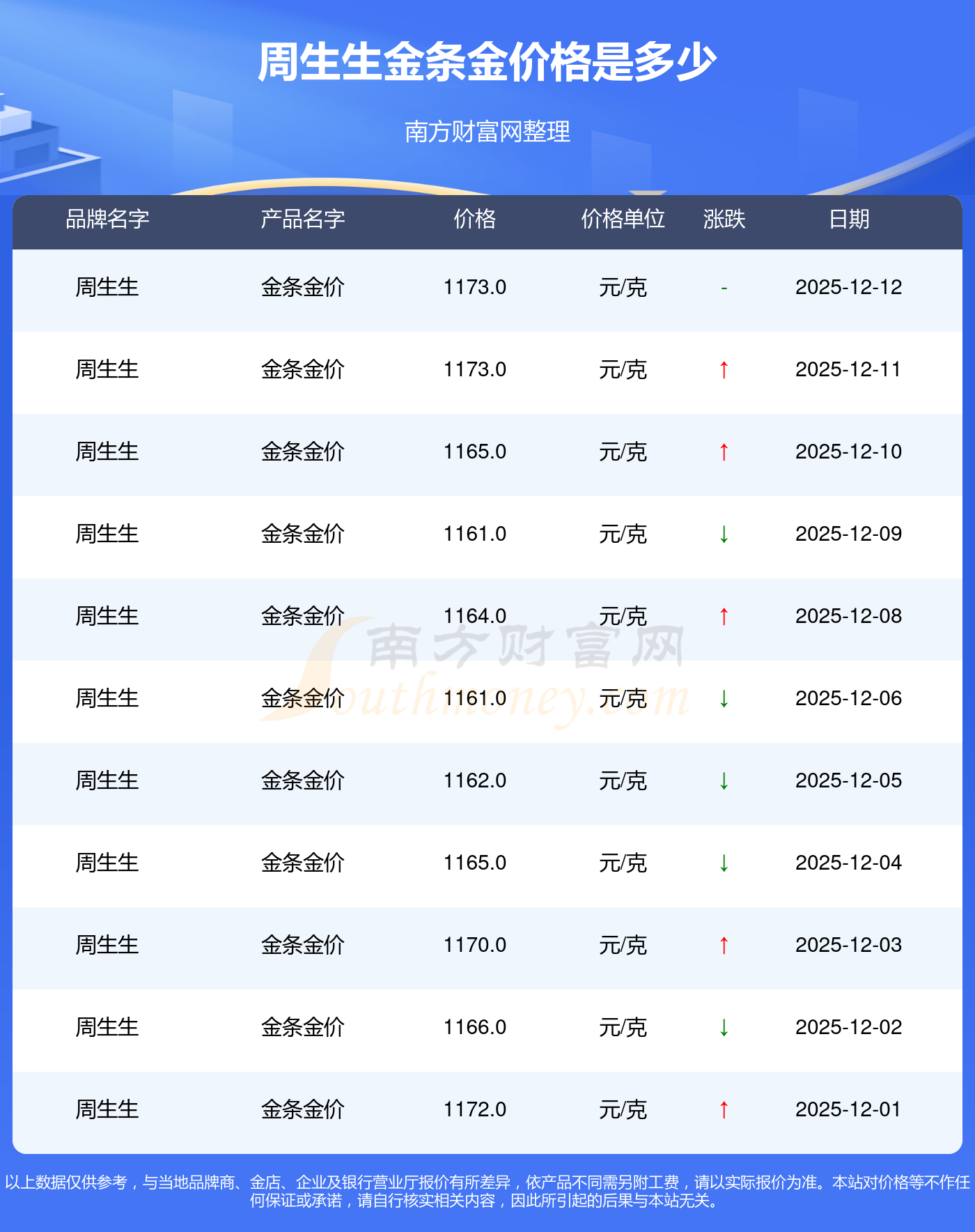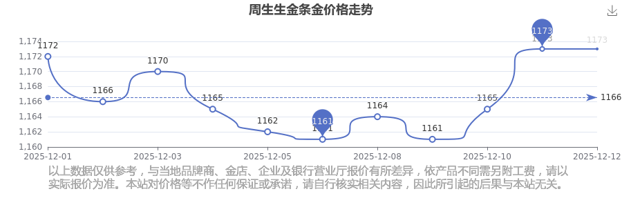 今日周生生 金條金價最新的市場標(biāo)價為1173.0元/克。