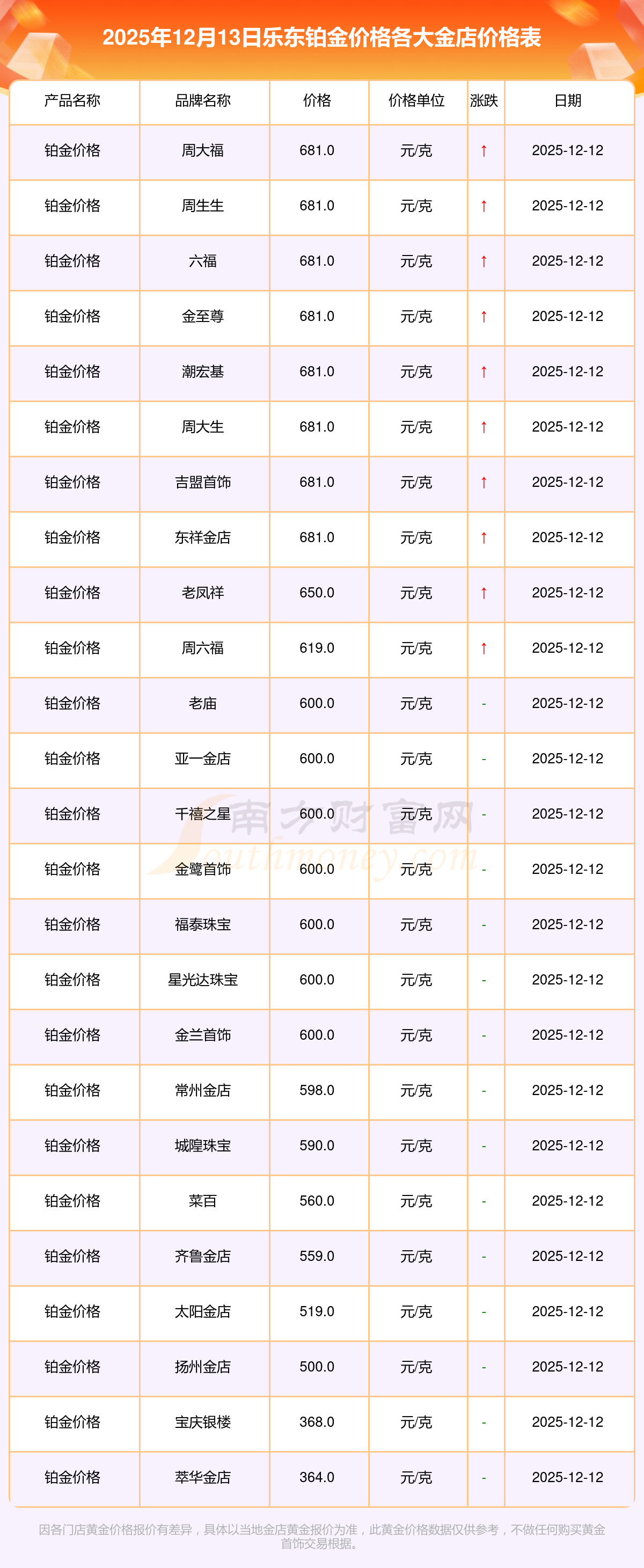 2025年12月13日樂(lè)東周大福、周大福、老鳳祥、老鳳祥、老廟、老廟、周生生、周生生、周大福、周大福、周大福等各大金店品牌鉑金價(jià)格最新價(jià)格行情來(lái)了,如下:周大福黃金價(jià)格1336.0元/克,周大福鉑金價(jià)格681.0元/克,老鳳祥黃金價(jià)格1337.0元/克,老鳳祥鉑金價(jià)格650.0元/克,老廟黃金價(jià)格1339.0元/克,老廟鉑金價(jià)格600.0元/克,周生生黃金價(jià)格1338.0元/克,周生生鉑金價(jià)格681.0元/克,周大福飾品金價(jià)(內(nèi)地)1336.0元/克,周大福黃金飾品(香港)47410.0,周大福鉑金價(jià)格(香港)19550.0。