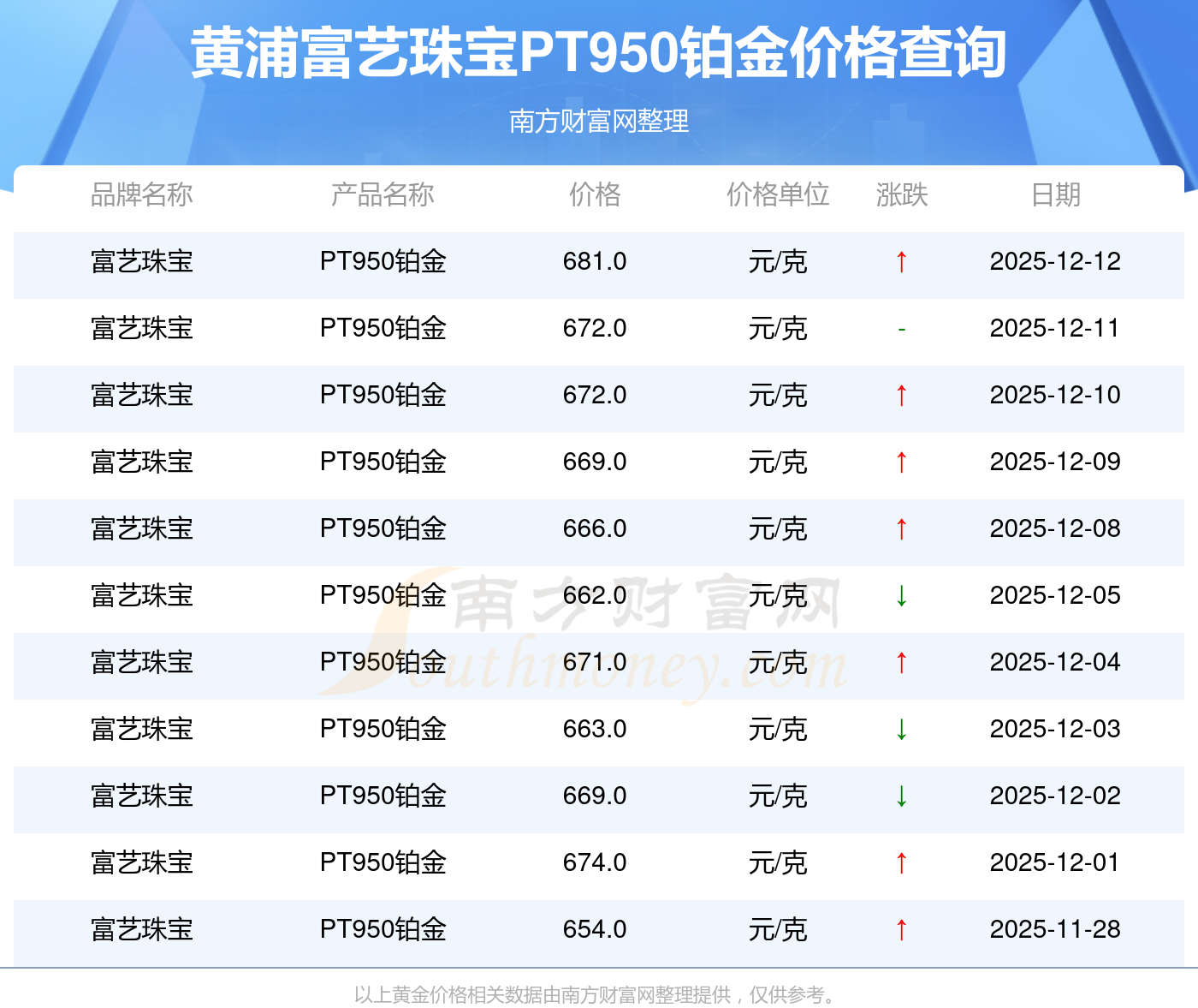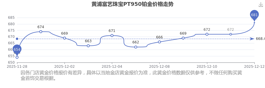 求問(wèn)黃浦富藝珠寶今日一克黃金的價(jià)格是多少?今日黃浦富藝珠寶PT950鉑金價(jià)格查詢,2025年12月13日黃浦富藝珠寶PT950鉑金價(jià)格:681.0元/克。