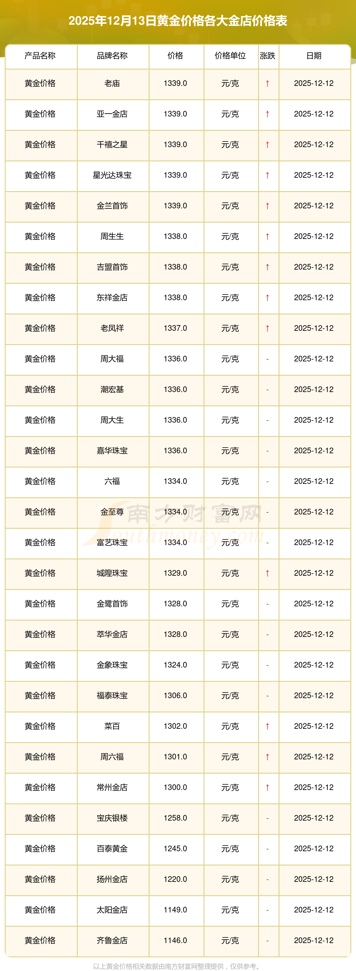 2025年12月13日各大金店黃金價格最新價格:周大福1336.0元/克,周大福681.0元/克,老鳳祥1337.0元/克,老鳳祥650.0元/克,老廟1339.0元/克,老廟600.0元/克,周生生1338.0元/克,周生生681.0元/克,周大福1336.0元/克,周大福47410.0,周大福19550.0。