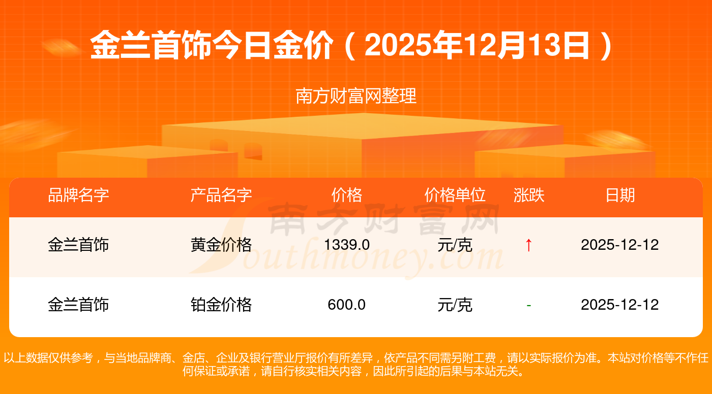 金蘭首飾現(xiàn)在金價(jià)多少錢一克?金蘭首飾今天黃金價(jià)格多少一克?最新金蘭首飾查詢,2025年12月13日金蘭首飾黃金價(jià)格現(xiàn)在每克多少錢?最新金蘭首飾黃金價(jià)格報(bào)價(jià)公布,一起來看看吧!