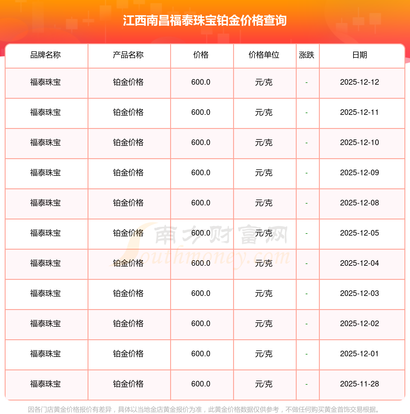 2025年12月14日,江西南昌福泰珠寶鉑金價(jià)格每克的價(jià)值量定格在600.0元/克。
