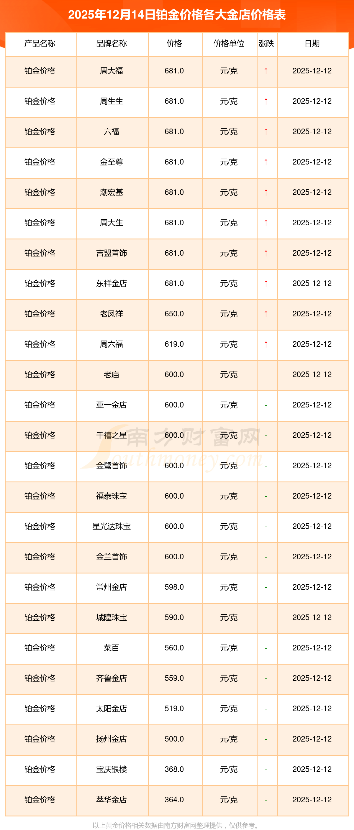 各大金店鉑金價格最新價格公布,2025年12月14日各大金店鉑金價格多少錢一克?