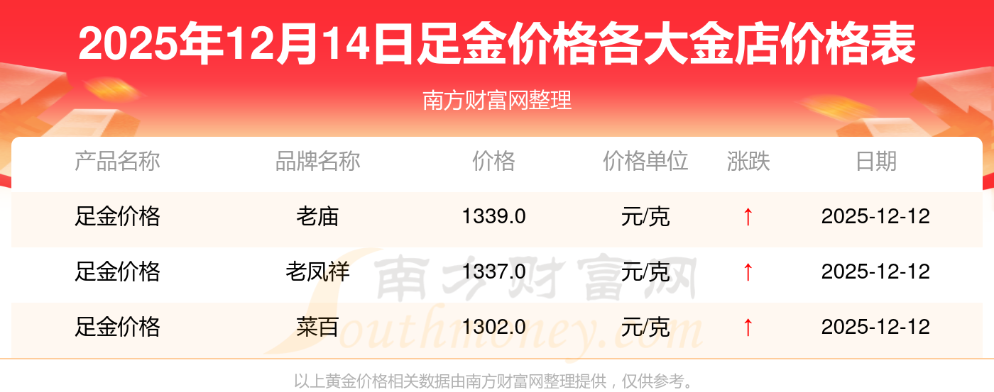 今天是2025年12月14日,周大福、周大福、老鳳祥、老鳳祥、老廟、老廟、周生生、周生生、周大福、周大福、周大福等各大金店品牌足金價(jià)格最新價(jià)格如下:周大福1336.0元/克、周大福681.0元/克、老鳳祥1337.0元/克、老鳳祥650.0元/克、老廟1339.0元/克、老廟600.0元/克、周生生1338.0元/克、周生生681.0元/克、周大福1336.0元/克、周大福47410.0、周大福19550.0。