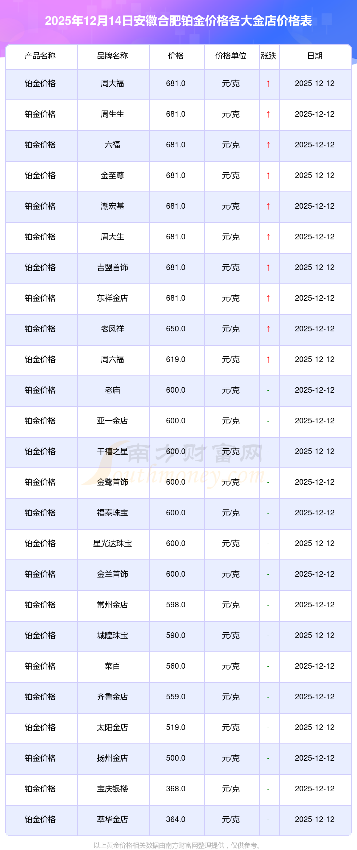 2025年12月14日安徽合肥各大金店鉑金價(jià)格最新價(jià)格查詢來了:周大福1336.0元/克,周大福681.0元/克,老鳳祥1337.0元/克,老鳳祥650.0元/克,老廟1339.0元/克,老廟600.0元/克,周生生1338.0元/克,周生生681.0元/克,周大福1336.0元/克,周大福47410.0,周大福19550.0。