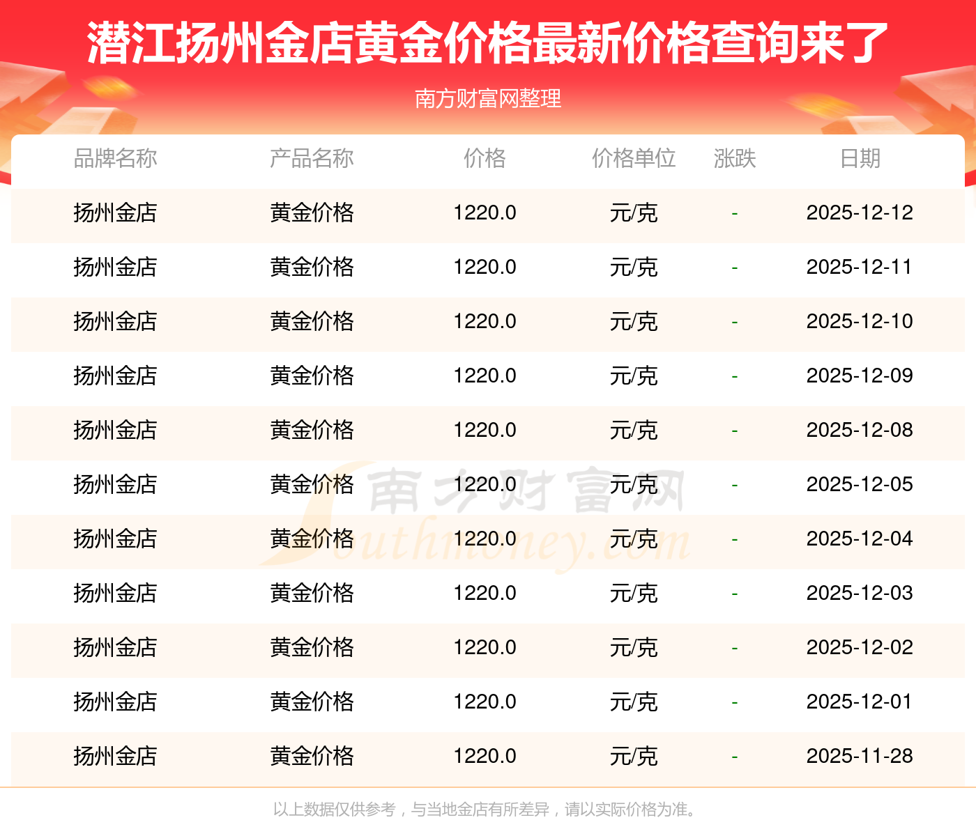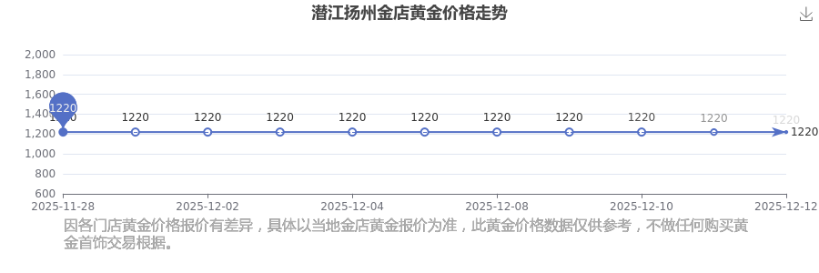 潛江揚(yáng)州金店在 2025年12月14日,黃金價(jià)格的售賣價(jià)格是 1220.0元/克。