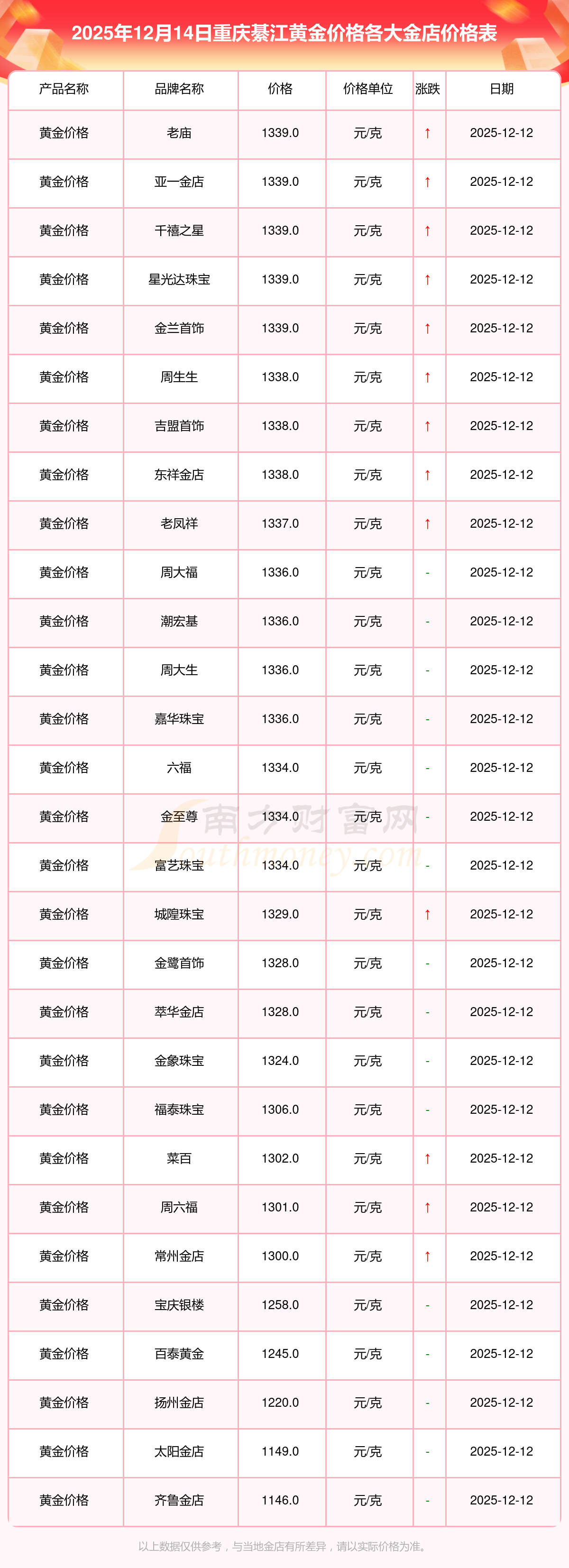 2025年12月14日重慶綦江各大金店黃金價格最新價格查詢來了:周大福1336.0元/克,周大福681.0元/克,老鳳祥1337.0元/克,老鳳祥650.0元/克,老廟1339.0元/克,老廟600.0元/克,周生生1338.0元/克,周生生681.0元/克,周大福1336.0元/克,周大福47410.0,周大福19550.0。