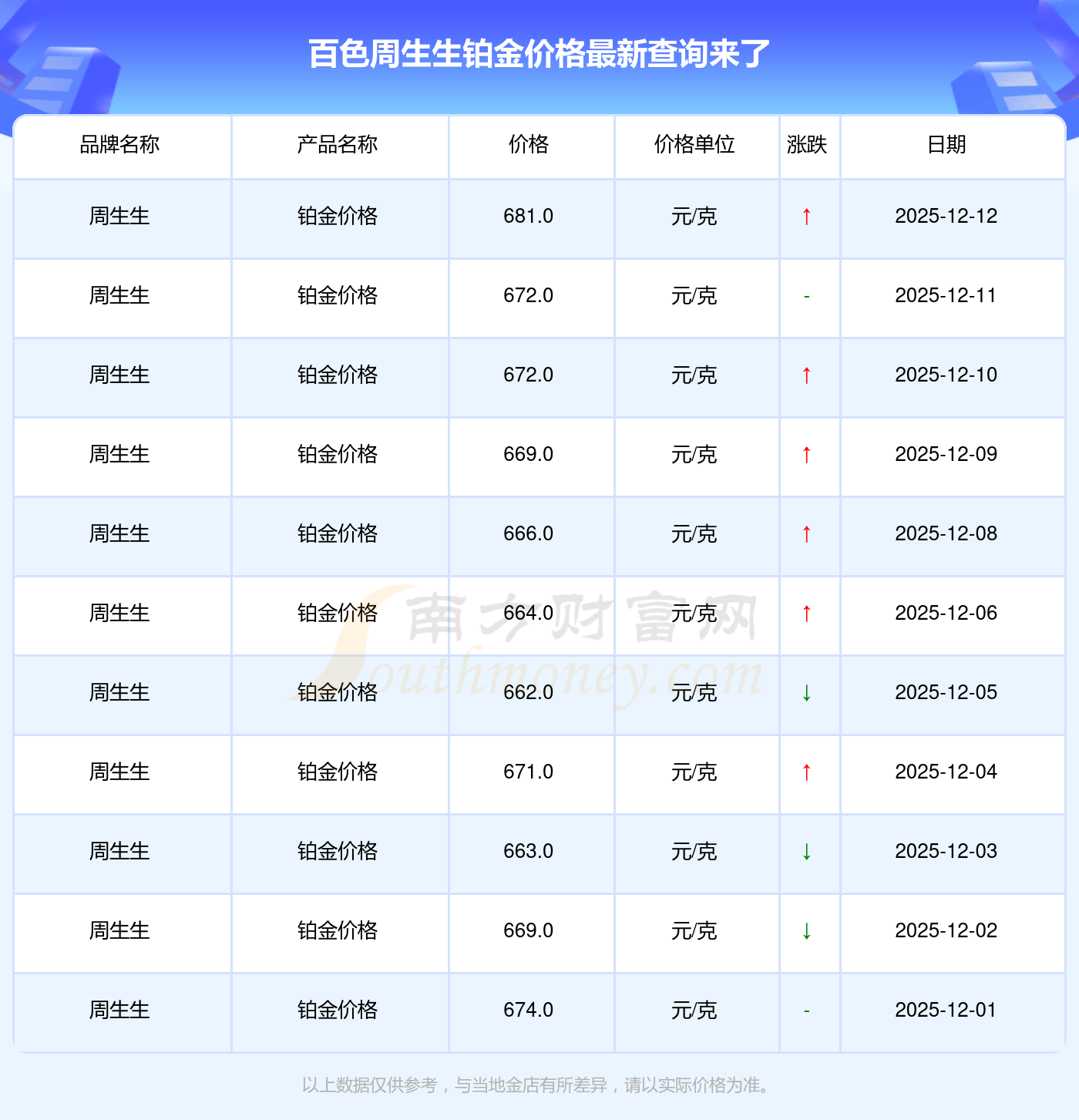 今日2025年12月14日,百色周生生鉑金價(jià)格為681.0元/克。