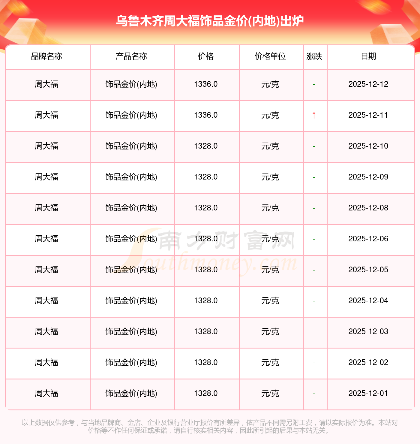 2025年12月14日,周大福、周大福、老鳳祥、老鳳祥、老廟、老廟、周生生、周生生、周大福、周大福、周大福等各大金店品牌飾品金價(內(nèi)地)今日價格如下:周大福1336.0元/克、周大福681.0元/克、老鳳祥1337.0元/克、老鳳祥650.0元/克、老廟1339.0元/克、老廟600.0元/克、周生生1338.0元/克、周生生681.0元/克、周大福1336.0元/克、周大福47410.0、周大福19550.0。