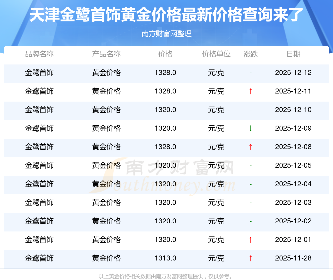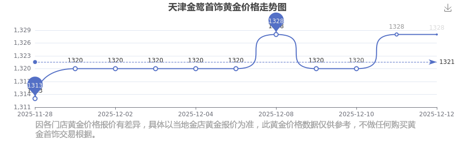 2025年12月14日,天津金鷺首飾的黃金價(jià)格標(biāo)價(jià)達(dá)到 1328.0元/克。