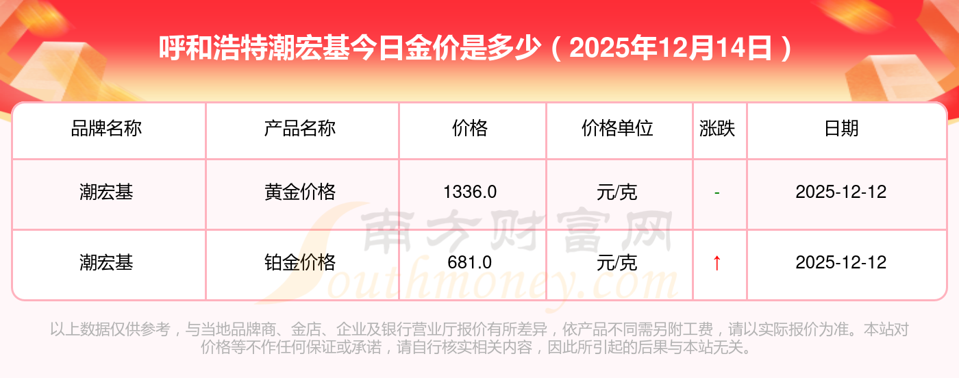 2025年12月14日呼和浩特潮宏基今日價(jià)格:黃金價(jià)格1336.0元/克,鉑金價(jià)格681.0元/克,黃金價(jià)格1337.0元/克,鉑金價(jià)格650.0元/克,黃金價(jià)格1339.0元/克,鉑金價(jià)格600.0元/克,黃金價(jià)格1338.0元/克,鉑金價(jià)格681.0元/克,飾品金價(jià)(內(nèi)地)1336.0元/克,黃金飾品(香港)47410.0,鉑金價(jià)格(香港)19550.0。