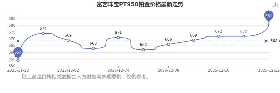 今日富藝珠寶所公布的 PT950鉑金最新價(jià)格為681.0元/克。