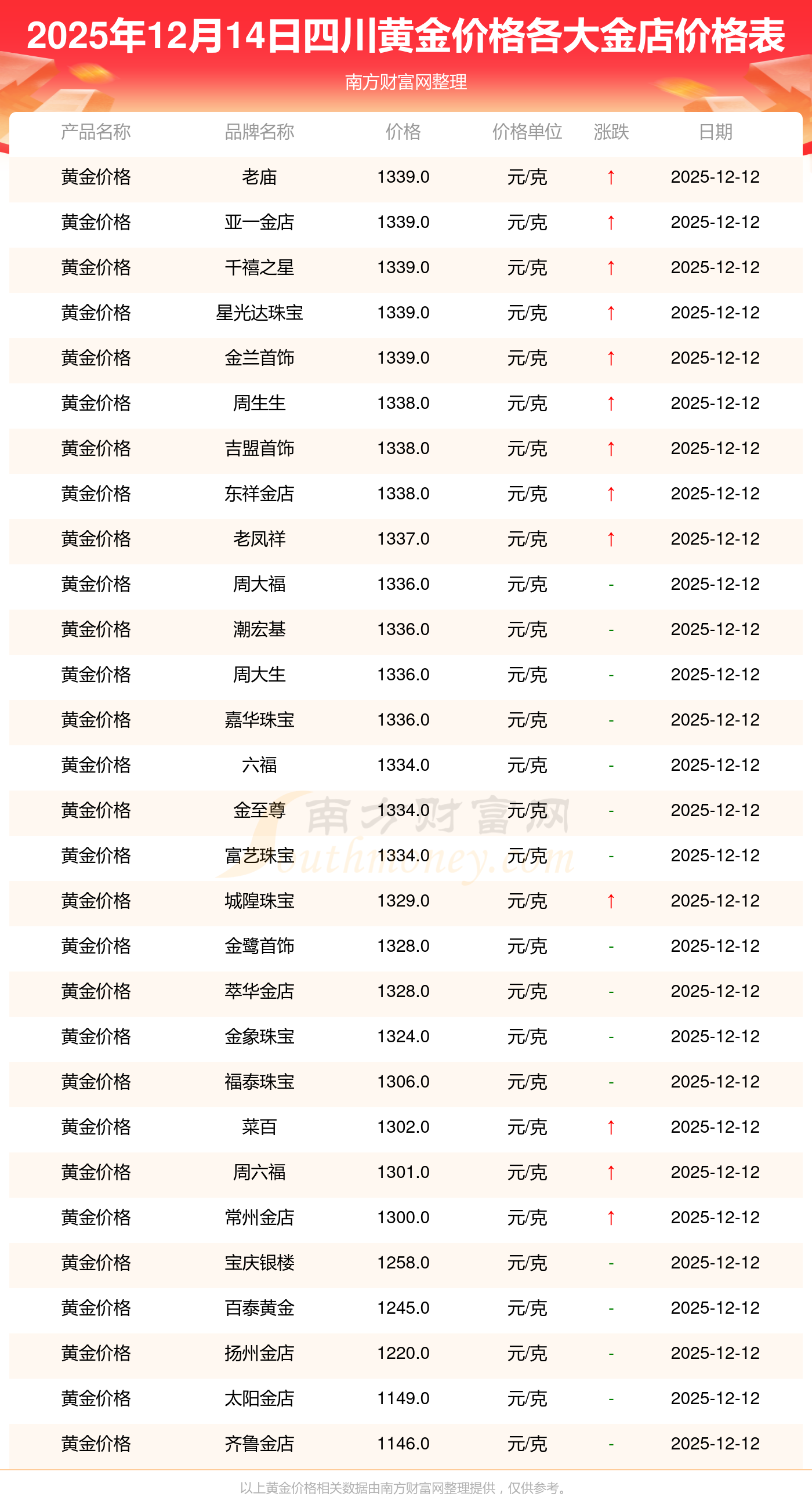 今天是2025年12月14日,四川周大福、周大福、老鳳祥、老鳳祥、老廟、老廟、周生生、周生生、周大福、周大福、周大福等各大金店品牌黃金價(jià)格最新價(jià)格如下:周大福1336.0元/克、周大福681.0元/克、老鳳祥1337.0元/克、老鳳祥650.0元/克、老廟1339.0元/克、老廟600.0元/克、周生生1338.0元/克、周生生681.0元/克、周大福1336.0元/克、周大福47410.0、周大福19550.0。