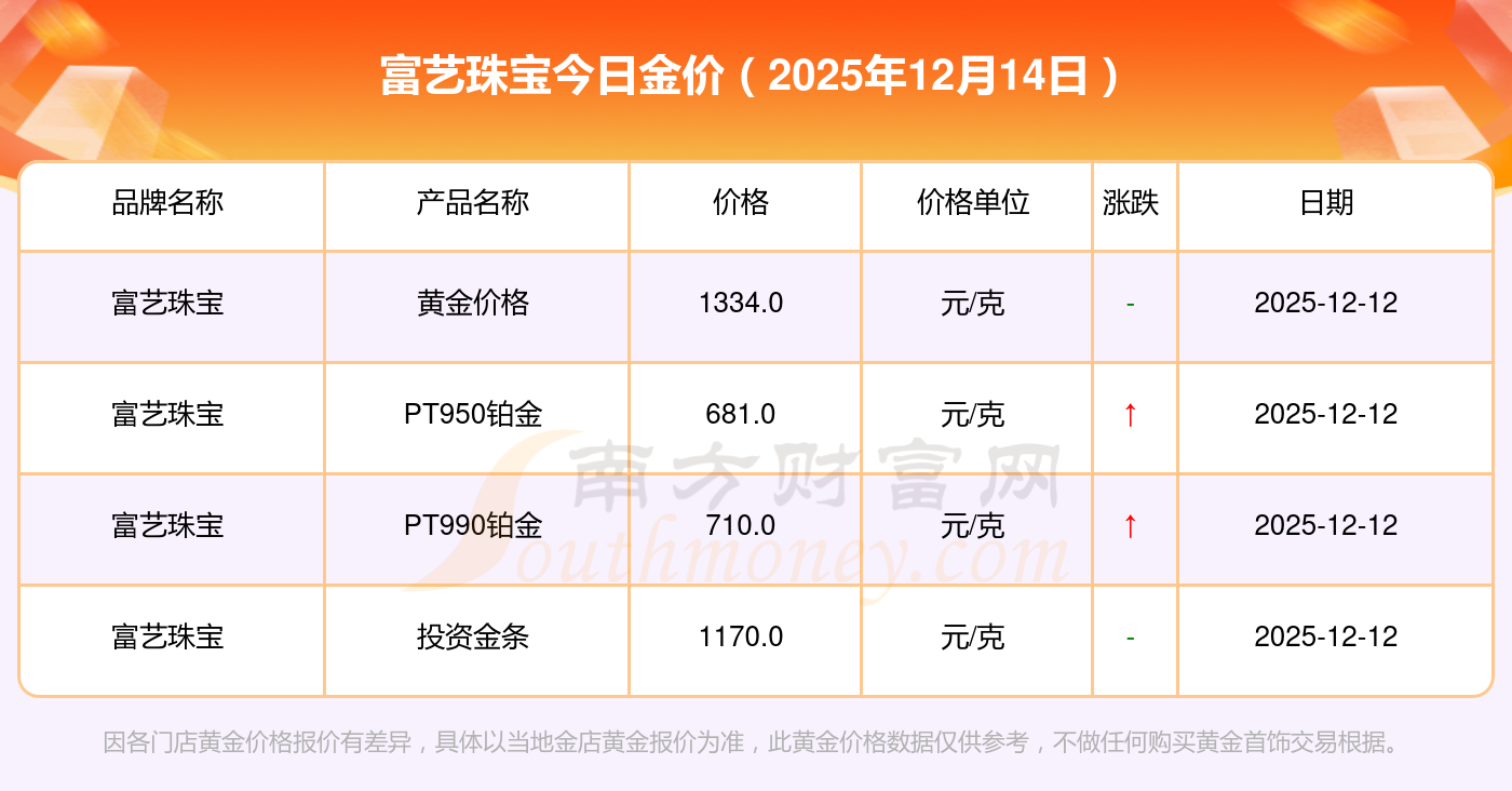 現(xiàn)在富藝珠寶黃金價格是多少錢1克_2025年富藝珠寶今日金價是多少錢一克,最新富藝珠寶查詢,2025年12月14日富藝珠寶PT950鉑金現(xiàn)在每克多少錢?最新富藝珠寶PT950鉑金報價公布,一起來看看吧!