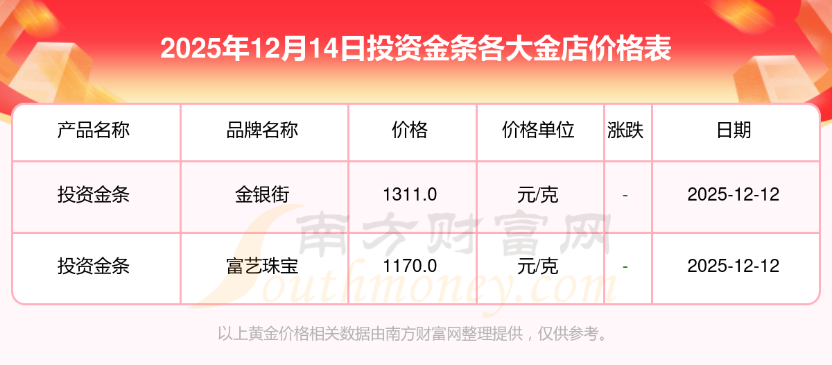 今天是2025年12月14日,周大福、周大福、老鳳祥、老鳳祥、老廟、老廟、周生生、周生生、周大福、周大福、周大福等各大金店品牌投資金條最新價格如下:周大福1336.0元/克、周大福681.0元/克、老鳳祥1337.0元/克、老鳳祥650.0元/克、老廟1339.0元/克、老廟600.0元/克、周生生1338.0元/克、周生生681.0元/克、周大福1336.0元/克、周大福47410.0、周大福19550.0。