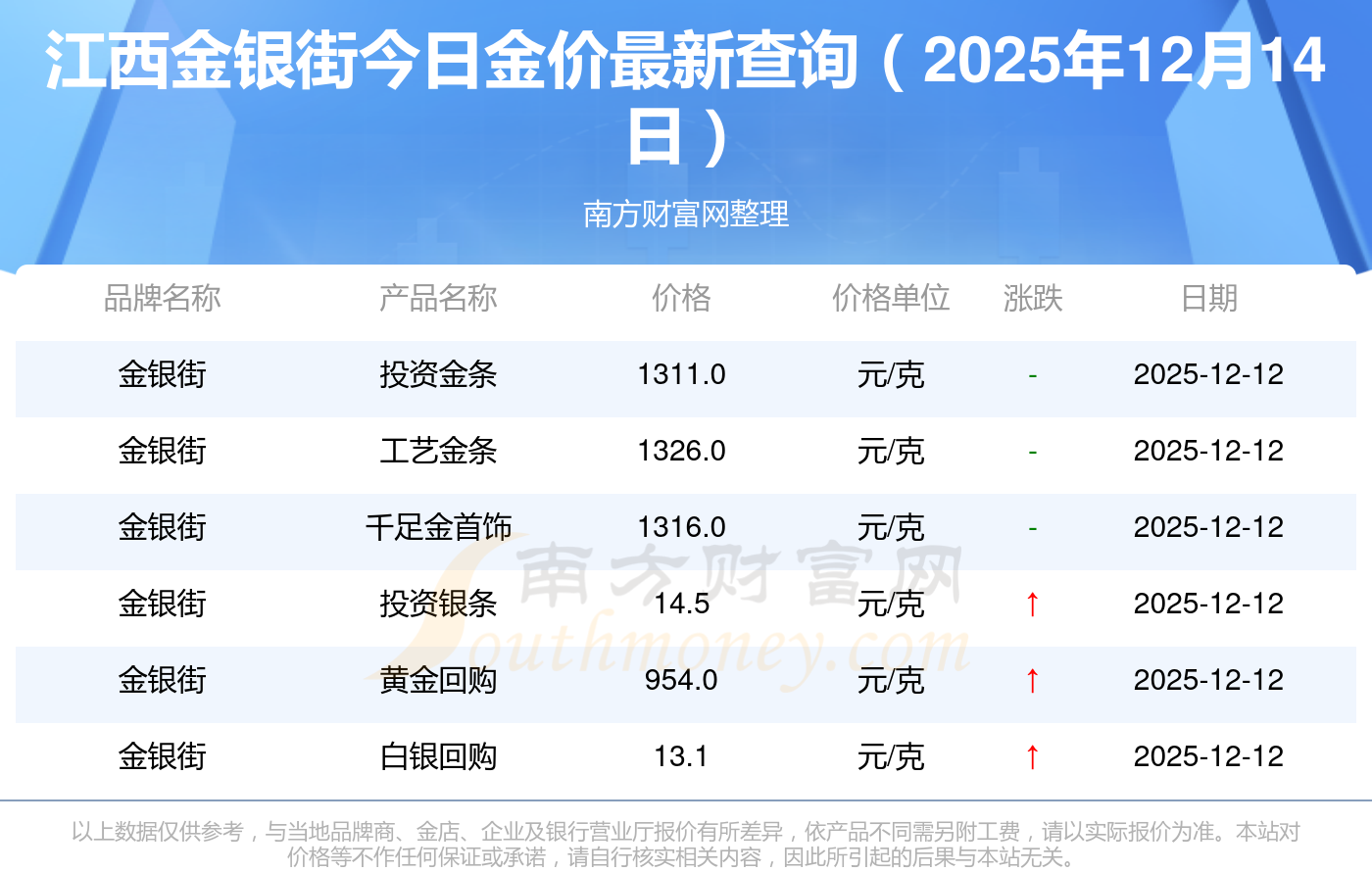 以上數(shù)據(jù)僅供參考,與當(dāng)?shù)仄放粕、金店、企業(yè)及銀行營業(yè)廳報價有所差異,依產(chǎn)品不同需另附工費,請以實際報價為準。本站對價格等不作任何保證或承諾,請自行核實相關(guān)內(nèi)容,因此所引起的后果與本站無關(guān)。