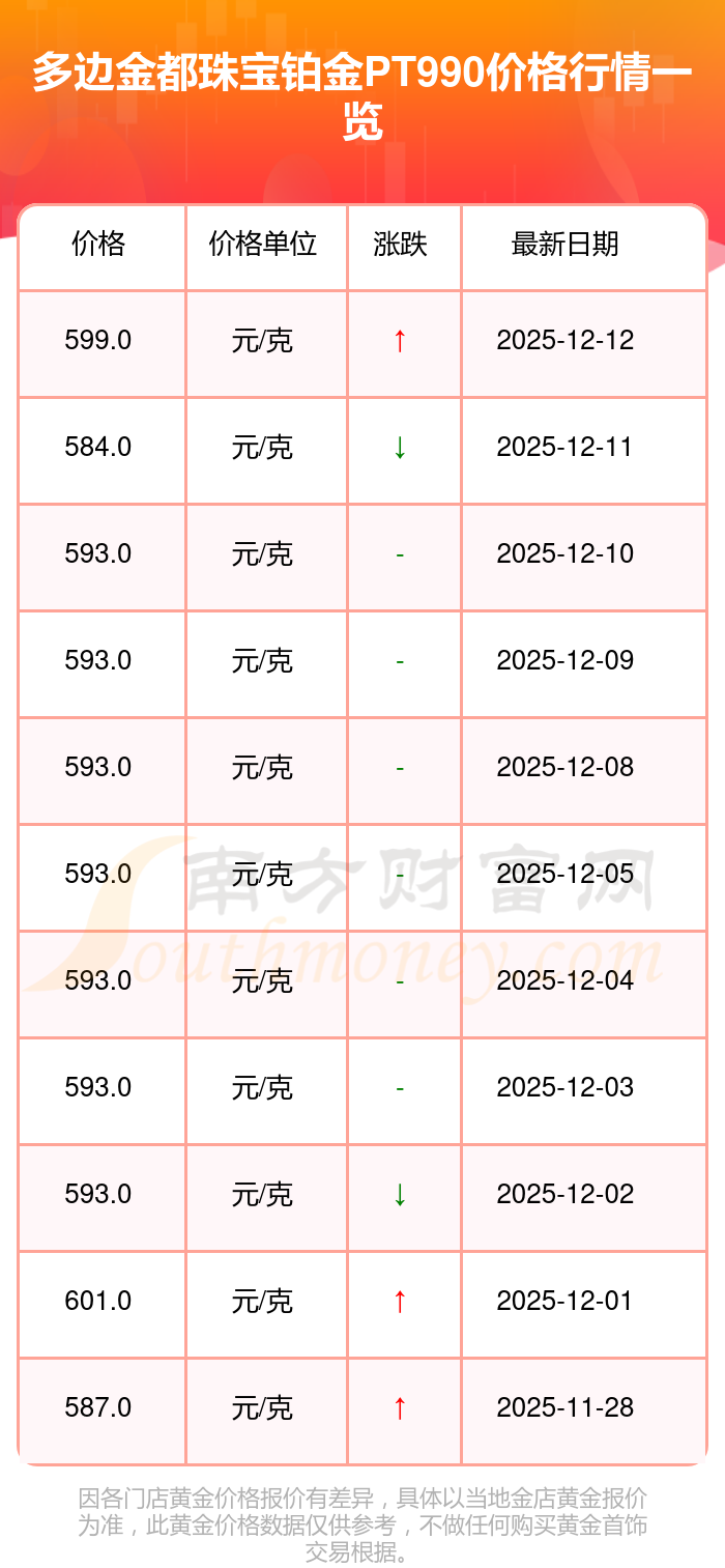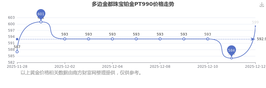 今日多邊金都珠寶鉑金PT990價(jià)格最新是599.0元/克。
