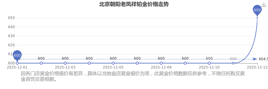 2025年12月14日,北京朝陽老鳳祥所售鉑金價(jià)格,其價(jià)格設(shè)定為 650.0元/克。