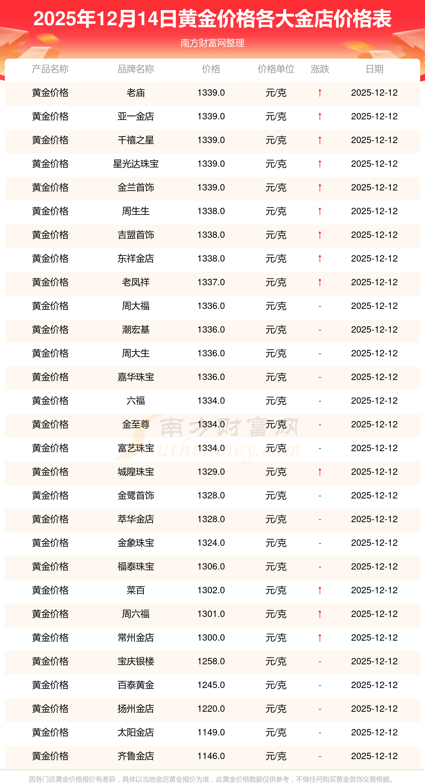 2025年12月14日各大金店黃金價(jià)格最新價(jià)格:周大福1336.0元/克,周大福681.0元/克,老鳳祥1337.0元/克,老鳳祥650.0元/克,老廟1339.0元/克,老廟600.0元/克,周生生1338.0元/克,周生生681.0元/克,周大福1336.0元/克,周大福47410.0,周大福19550.0。