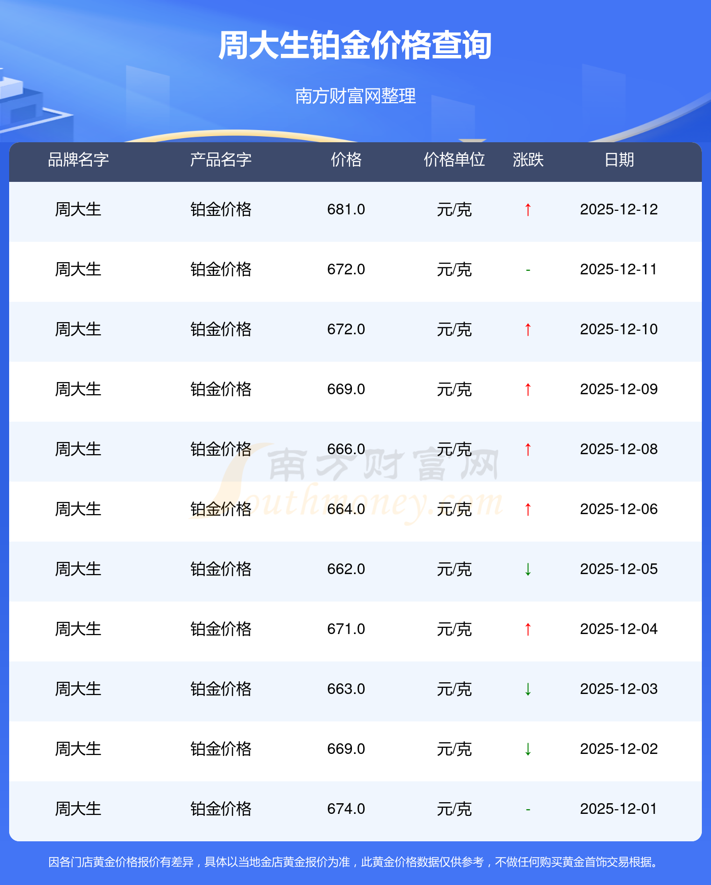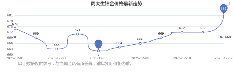 據(jù)了解,周大生今日鉑金價格為681.0元/克。