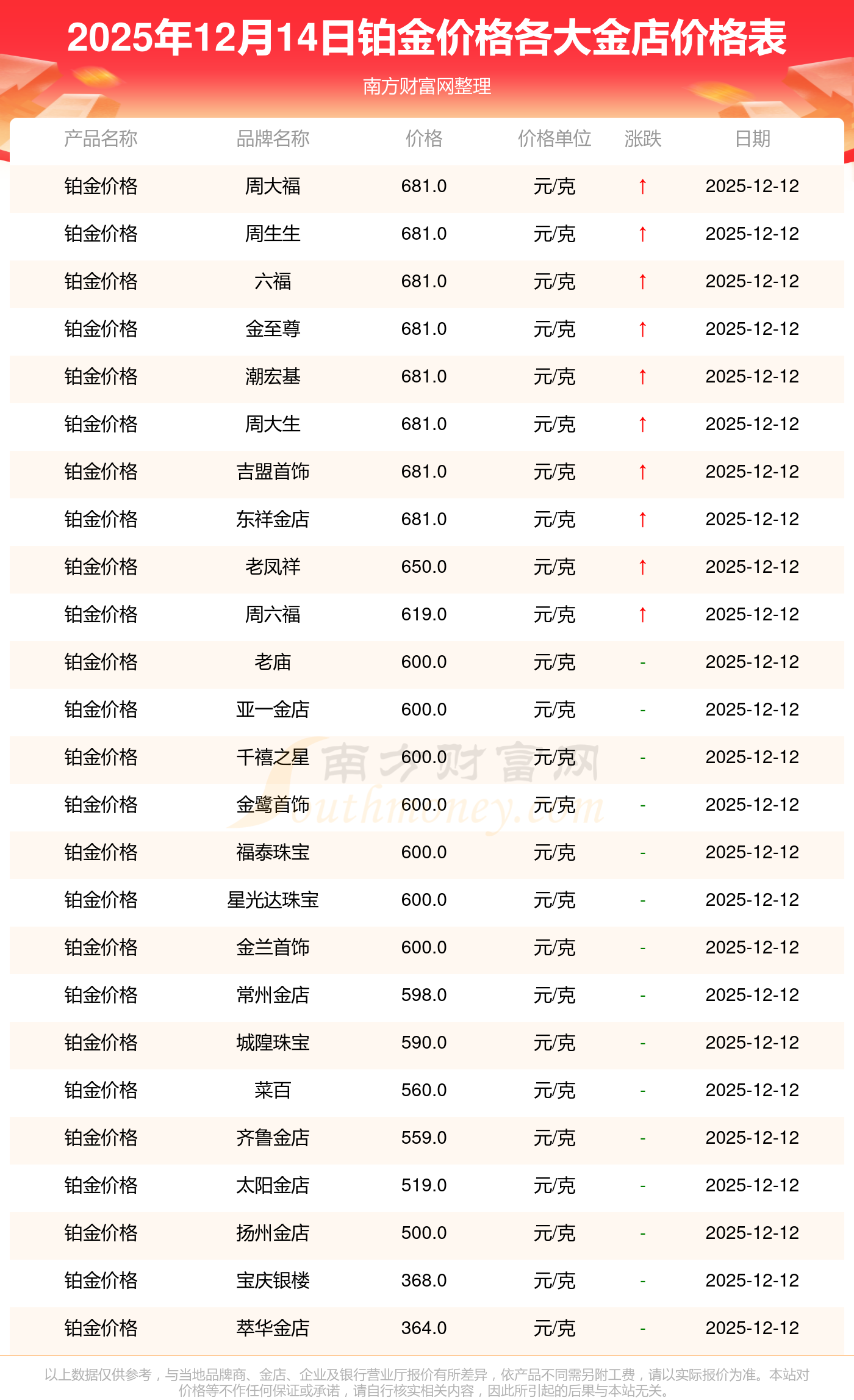 2025年12月14日,周大福、周大福、老鳳祥、老鳳祥、老廟、老廟、周生生、周生生、周大福、周大福、周大福等各大金店品牌鉑金價格今日價格如下:周大福1336.0元/克、周大福681.0元/克、老鳳祥1337.0元/克、老鳳祥650.0元/克、老廟1339.0元/克、老廟600.0元/克、周生生1338.0元/克、周生生681.0元/克、周大福1336.0元/克、周大福47410.0、周大福19550.0。