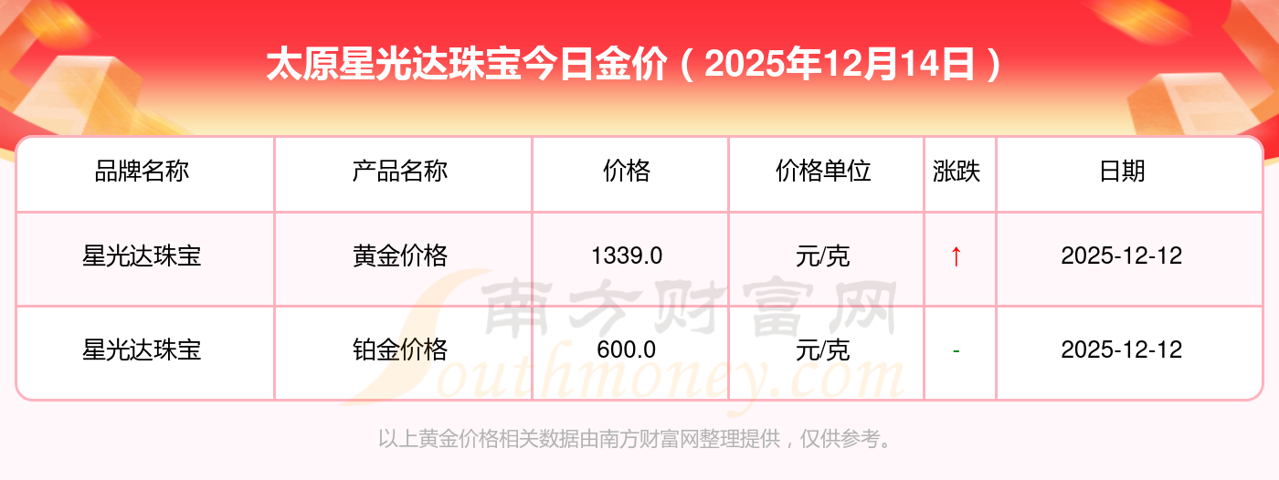 2025年12月14日太原星光達(dá)珠寶黃金的單價,一克為多少?黃金價格1336.0元/克,鉑金價格681.0元/克,黃金價格1337.0元/克,鉑金價格650.0元/克,黃金價格1339.0元/克,鉑金價格600.0元/克,黃金價格1338.0元/克,鉑金價格681.0元/克,飾品金價(內(nèi)地)1336.0元/克,黃金飾品(香港)47410.0,鉑金價格(香港)19550.0。
