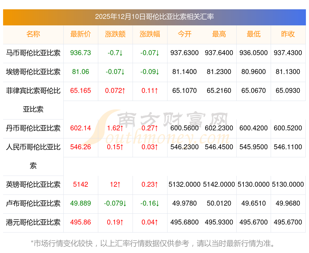 2025年12月10日哥倫比亞比索相關(guān)匯率查詢