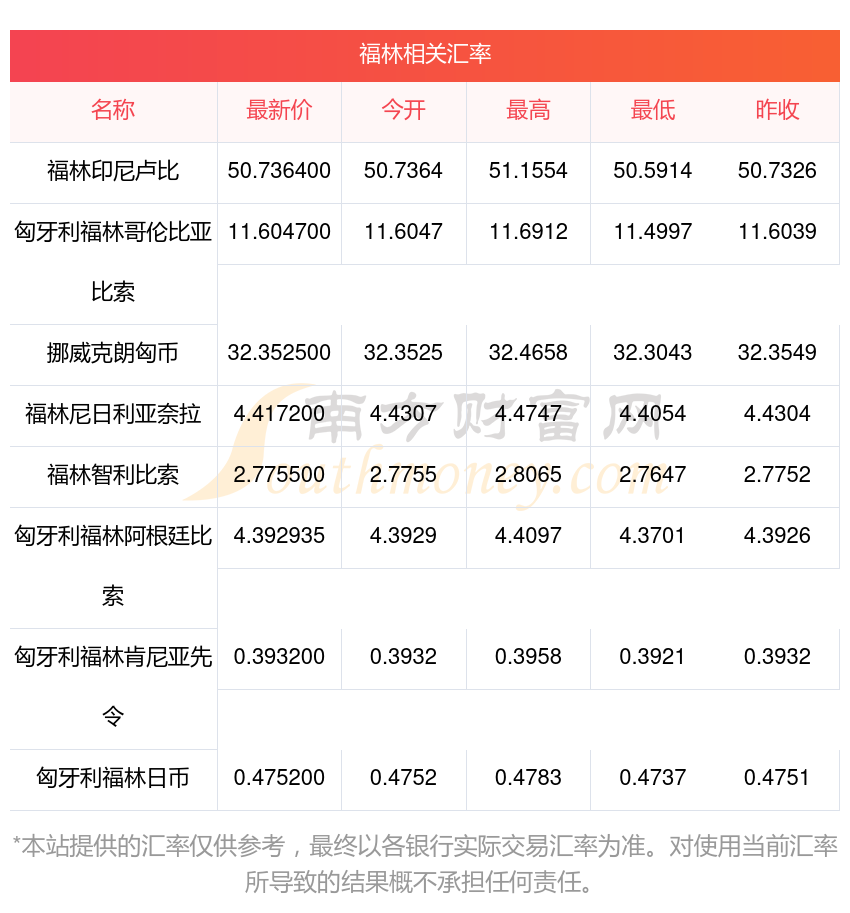 南方財富網(wǎng)為您提供福林對克朗匯率最新價格詳情。