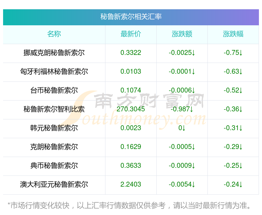 南方財富網(wǎng)為您提供秘魯新索爾對智利比索匯率最新價格詳情。