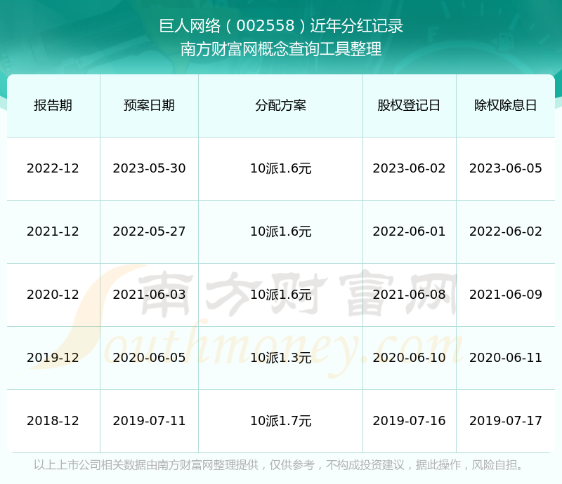 近年巨人網(wǎng)絡(luò)分紅情況如下表所示:
