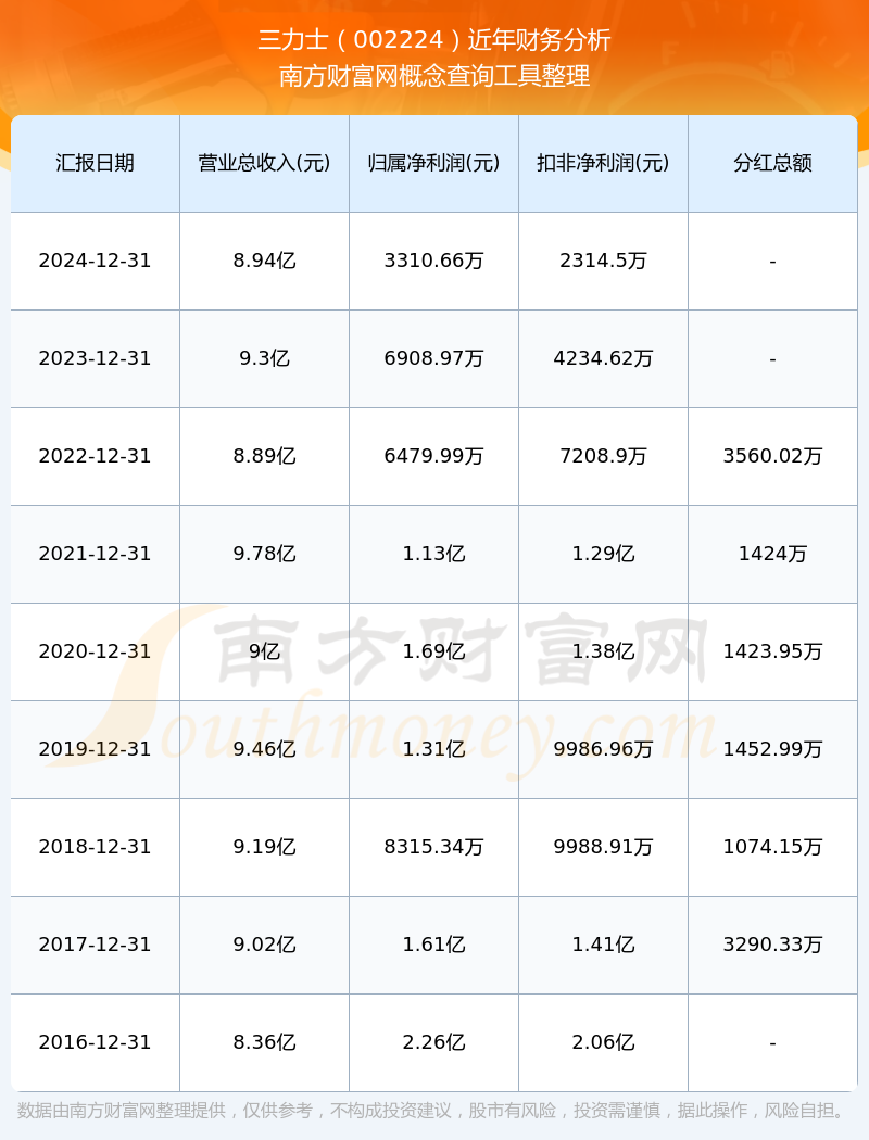 2024年報(bào)顯示,三力士實(shí)現(xiàn)營收8.94億,同比增長-3.84%;凈利潤3310.66萬,同比增長-52.08%;毛利率23.44%。