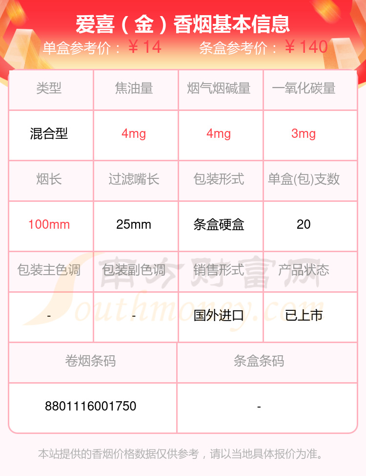煙堿超過2mg的ESSE(愛喜)香煙有哪些?擇煙網(wǎng)為大家整理盤點(diǎn),有愛喜(薄荷細(xì)支)、愛喜(金)等,詳細(xì)價(jià)格如下: