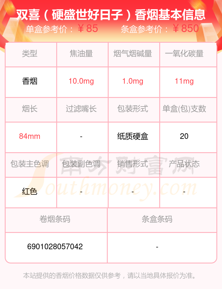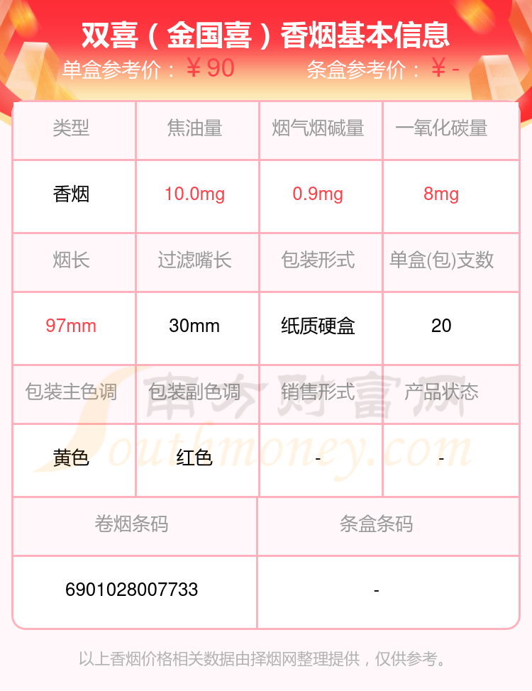 雙喜(金國喜)參考價90.0元/包、雙喜(珍藏)參考價90.0元/包、雙喜(硬盛世好日子)參考價85.0元/包、雙喜(春天1979)參考價80.0元/包等。