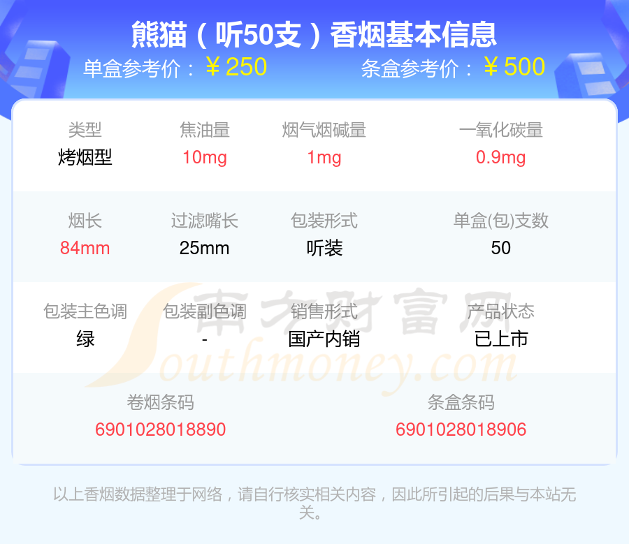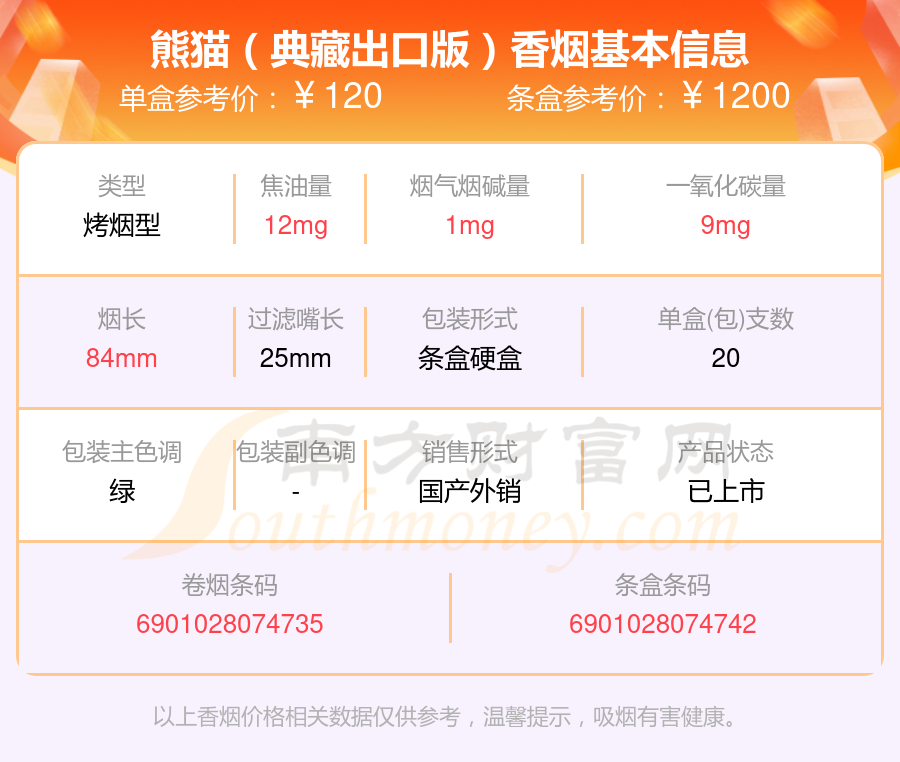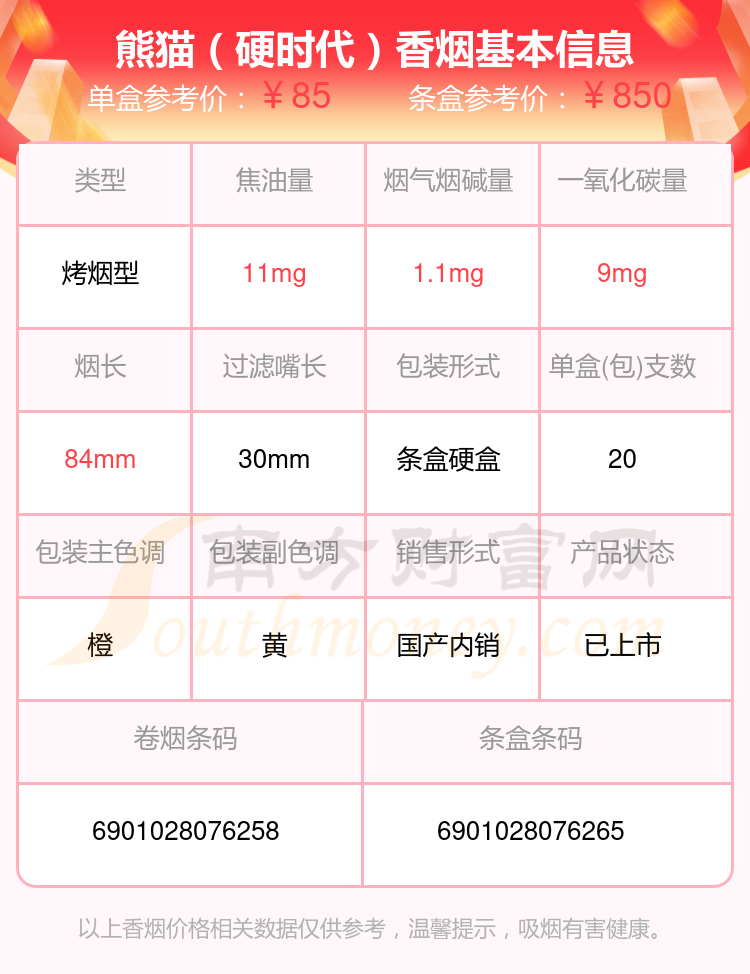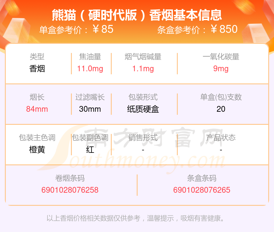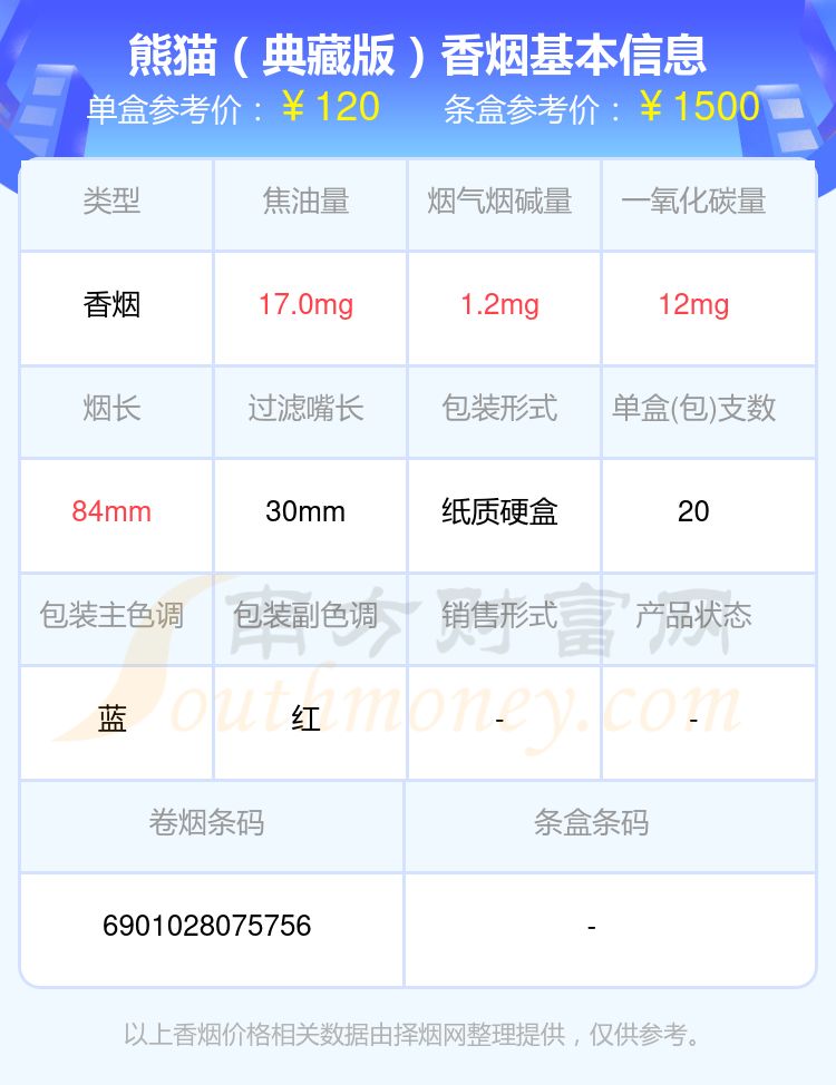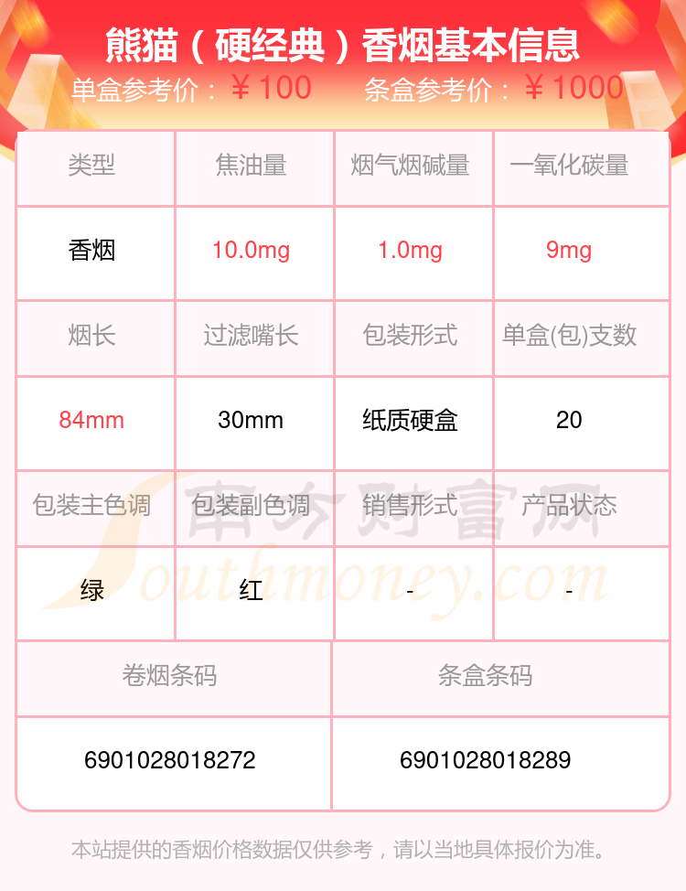 熊貓(硬時(shí)代版)參考價(jià)85.0元/包、熊貓(硬時(shí)代)參考價(jià)85元/包、熊貓(聽(tīng)50支)參考價(jià)250元/包、熊貓(典藏版)參考價(jià)120.0元/包、熊貓(典藏出口版)參考價(jià)120元/包、熊貓(硬經(jīng)典)參考價(jià)100.0元/包等。