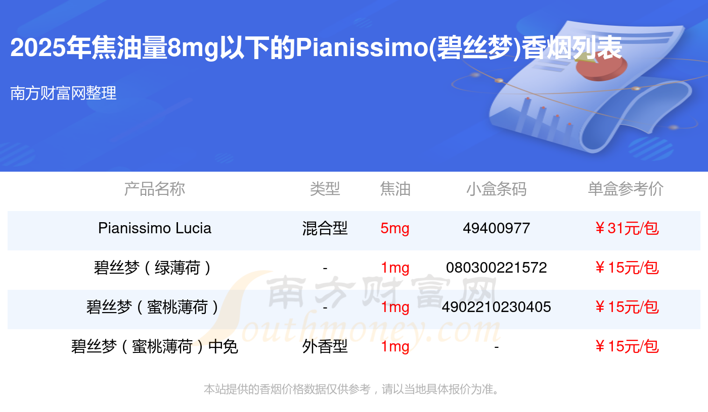 Pianissimo Lucia參考價(jià)31.0元/包、碧絲夢(綠薄荷)參考價(jià)15元/包、碧絲夢(蜜桃薄荷)參考價(jià)15元/包、碧絲夢(蜜桃薄荷)中免參考價(jià)15元/包等。