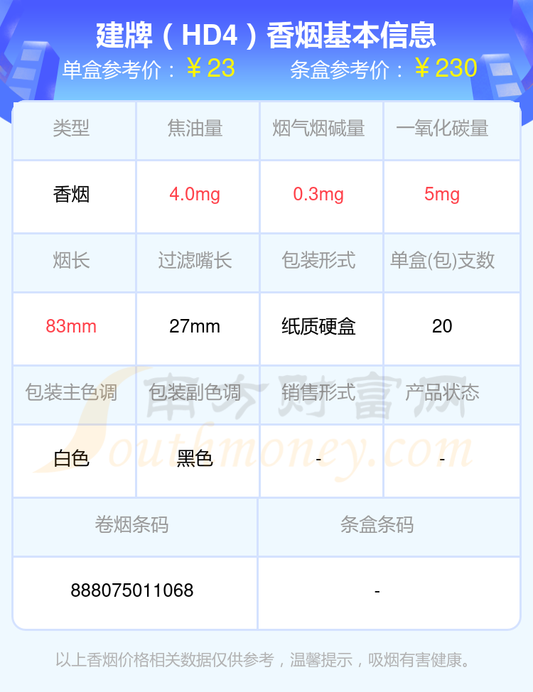 建牌(HD4)香煙網(wǎng)友評分:口味5.8分,外觀8.1分,性價比5.8分,綜合得分6.6分。