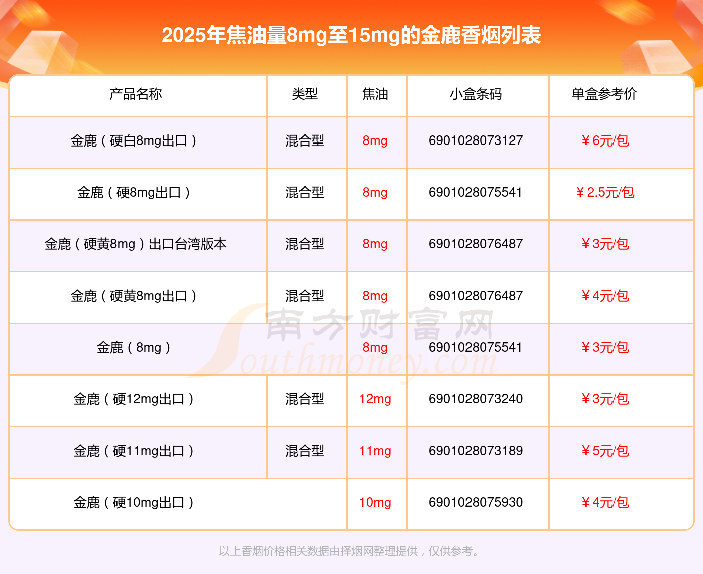 金鹿(硬白8mg出口)參考價(jià)6.0元/包、金鹿(硬8mg出口)參考價(jià)2.5元/包、金鹿(硬黃8mg)出口臺灣版本參考價(jià)3.0元/包、金鹿(硬黃8mg出口)參考價(jià)4.0元/包、金鹿(8mg)參考價(jià)3元/包、金鹿(硬12mg出口)參考價(jià)3.0元/包、金鹿(硬11mg出口)參考價(jià)5.0元/包、金鹿(硬10mg出口)參考價(jià)4元/包等。
