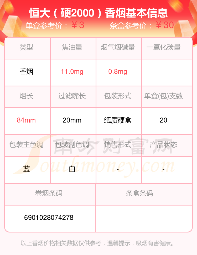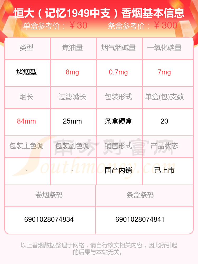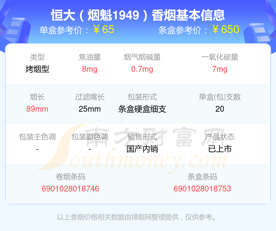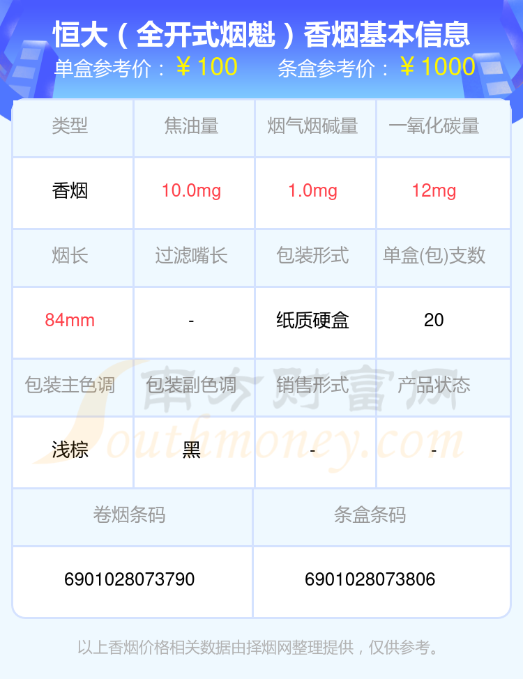 恒大(津門)參考價7元/包、恒大(煙魁1949)參考價65元/包、恒大(記憶1949中支)參考價30元/包、恒大(硬中支)參考價30元/包、恒大(煙魁1949中支)參考價65元/包、恒大(硬紅)參考價3.0元/包、恒大(軟80)參考價3.0元/包、恒大(硬2000)參考價3.0元/包、恒大(煙魁1919)參考價70.0元/包、恒大(全開式煙魁)參考價100.0元/包等。