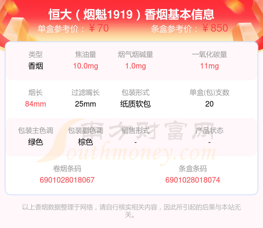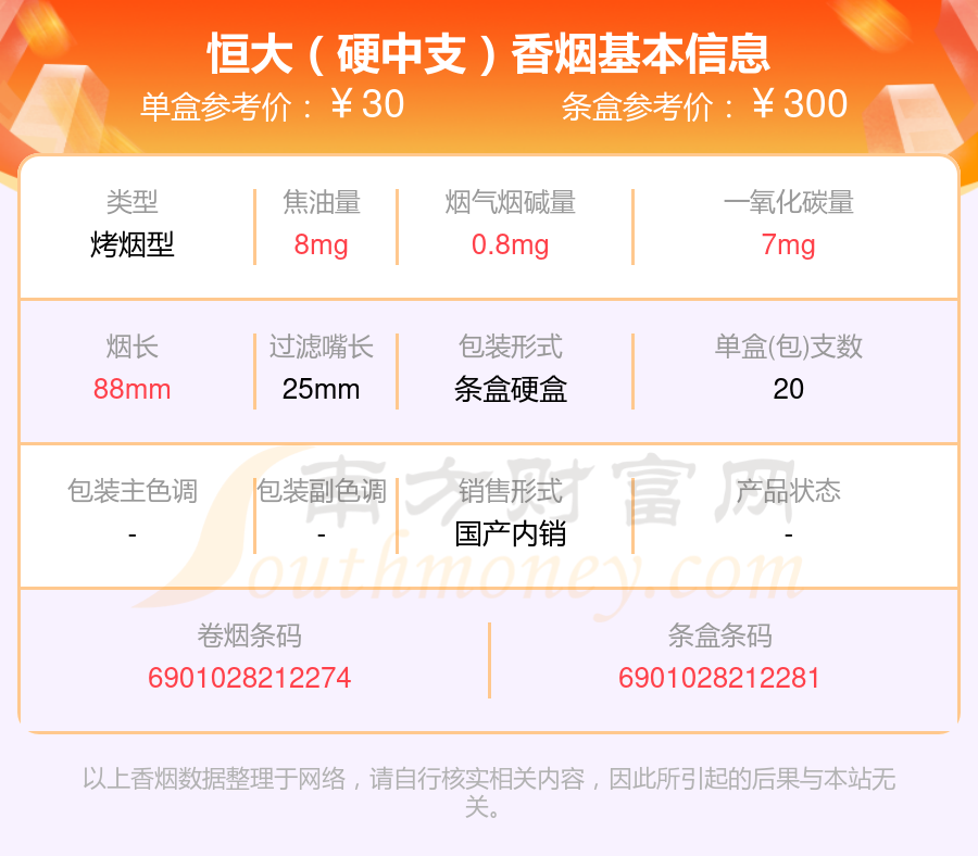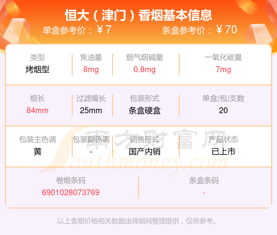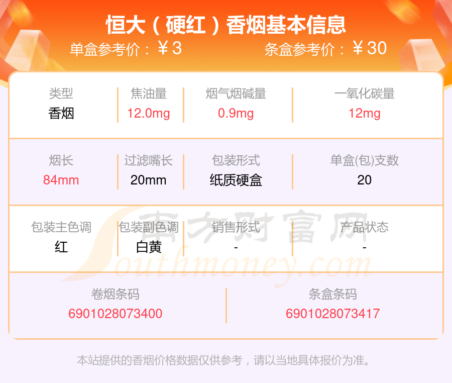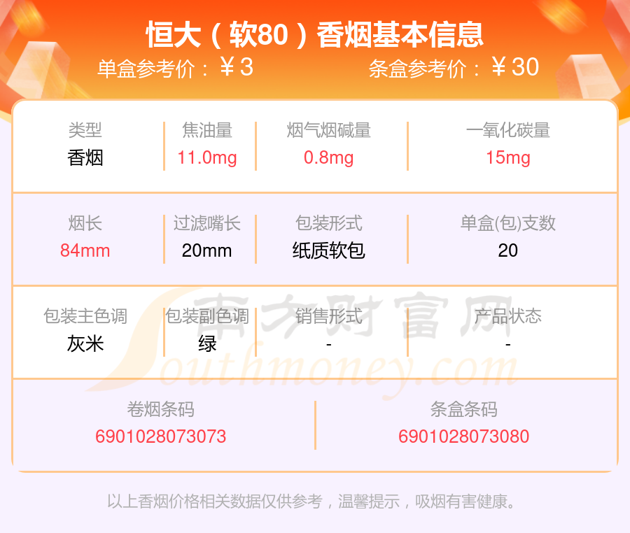 恒大(津門)參考價7元/包、恒大(煙魁1949)參考價65元/包、恒大(記憶1949中支)參考價30元/包、恒大(硬中支)參考價30元/包、恒大(煙魁1949中支)參考價65元/包、恒大(硬紅)參考價3.0元/包、恒大(軟80)參考價3.0元/包、恒大(硬2000)參考價3.0元/包、恒大(煙魁1919)參考價70.0元/包、恒大(全開式煙魁)參考價100.0元/包等。