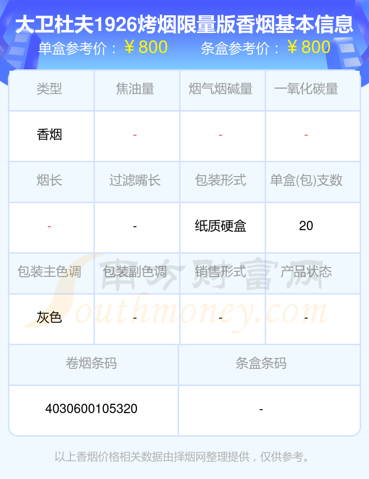 大衛(wèi)杜夫1926烤煙限量版條盒參考價:800元